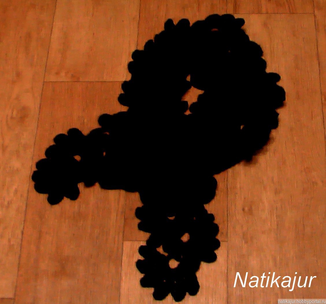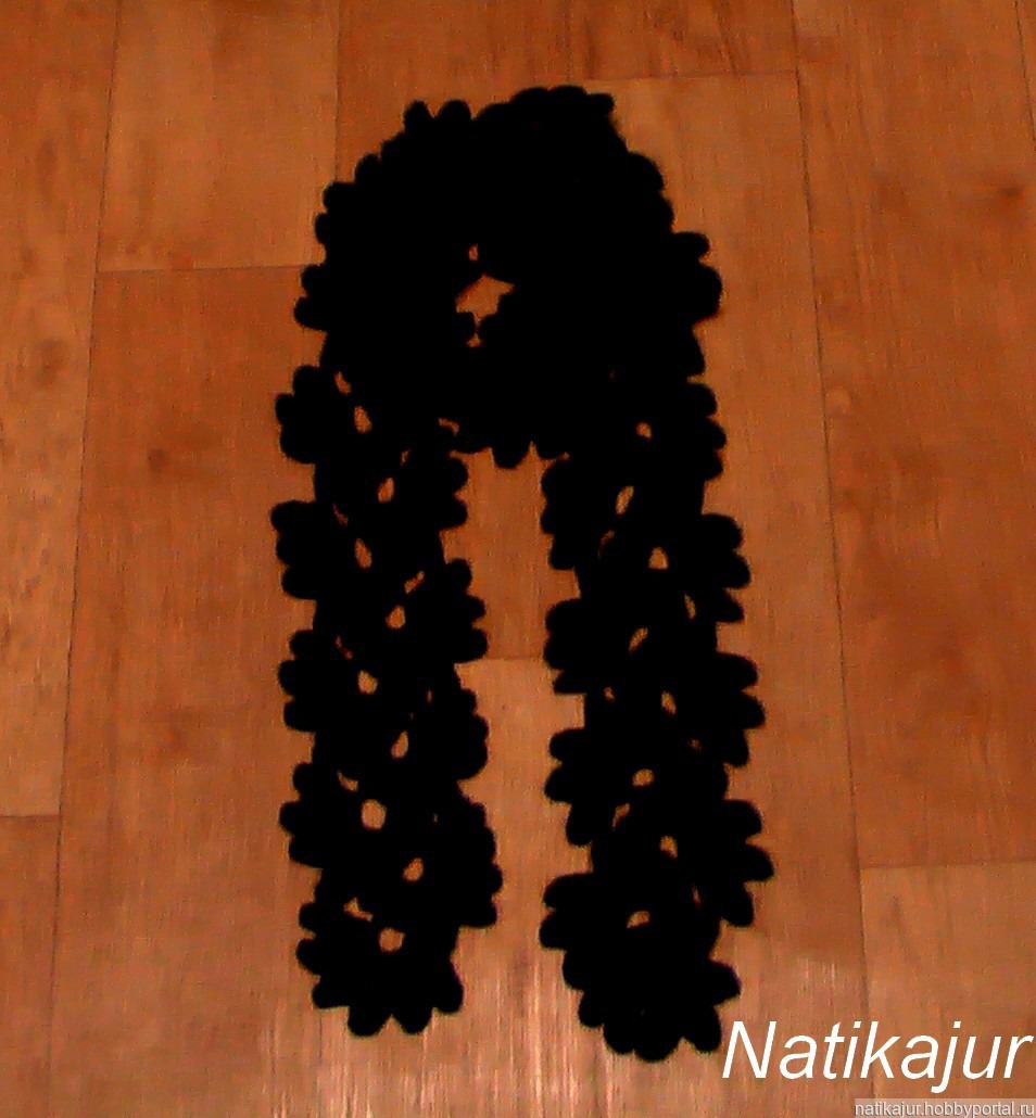 Эффектный шарф-боа насыщенного иссиня-черного цвета выполнен в технике ленточного кружева. В качестве аксессуара идеально подходит к любой верхней одежде - длинное или укороченное пальто, куртка и пр., а по цвету может как гармонировать с основной гаммой создаваемого образа, так и контрастировать с ней. Шарф можно и обмотать вокруг шеи несколько раз, оставив лишь небольшие свисающие концы, либо, перекинув единожды, позволить им свисать свободно и легко, придав всему образу оригинальность и неповторимый стиль.
