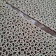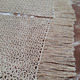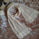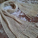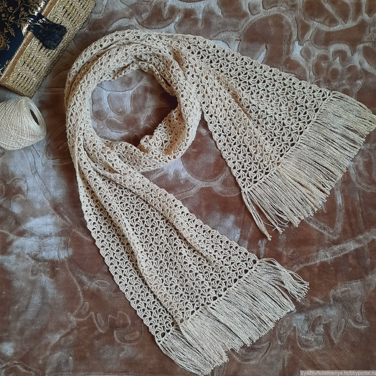 Шарф связан крючком из очень тонкой хлопковой пряжи цвета некрашеного льна с добавлением нити люрекса золотистого цвета.