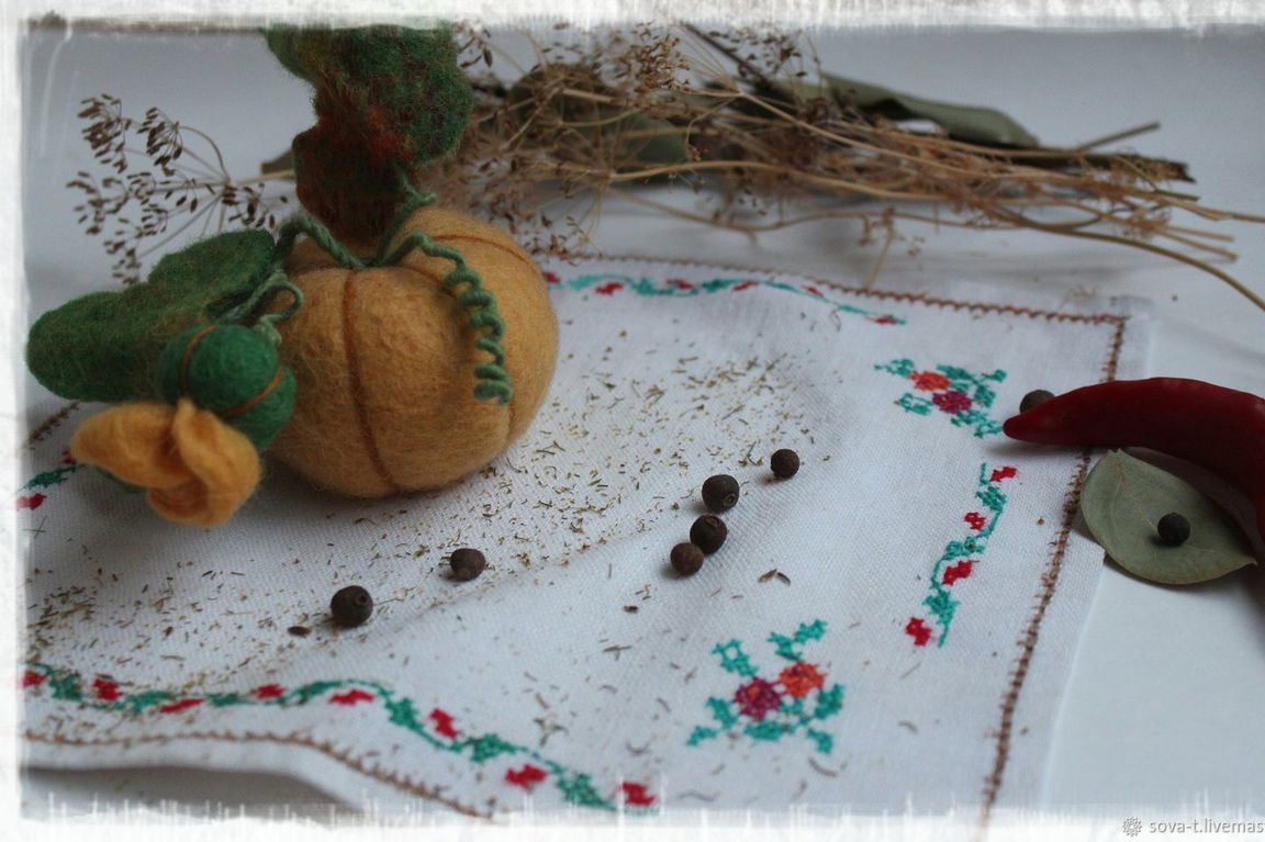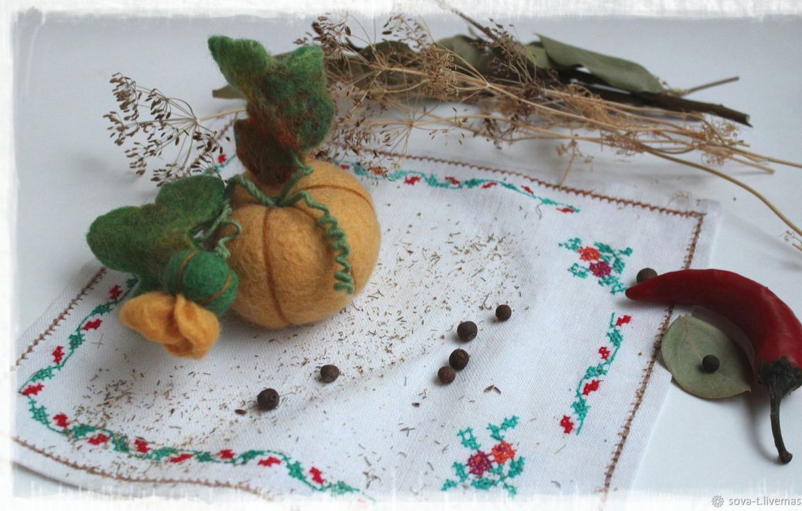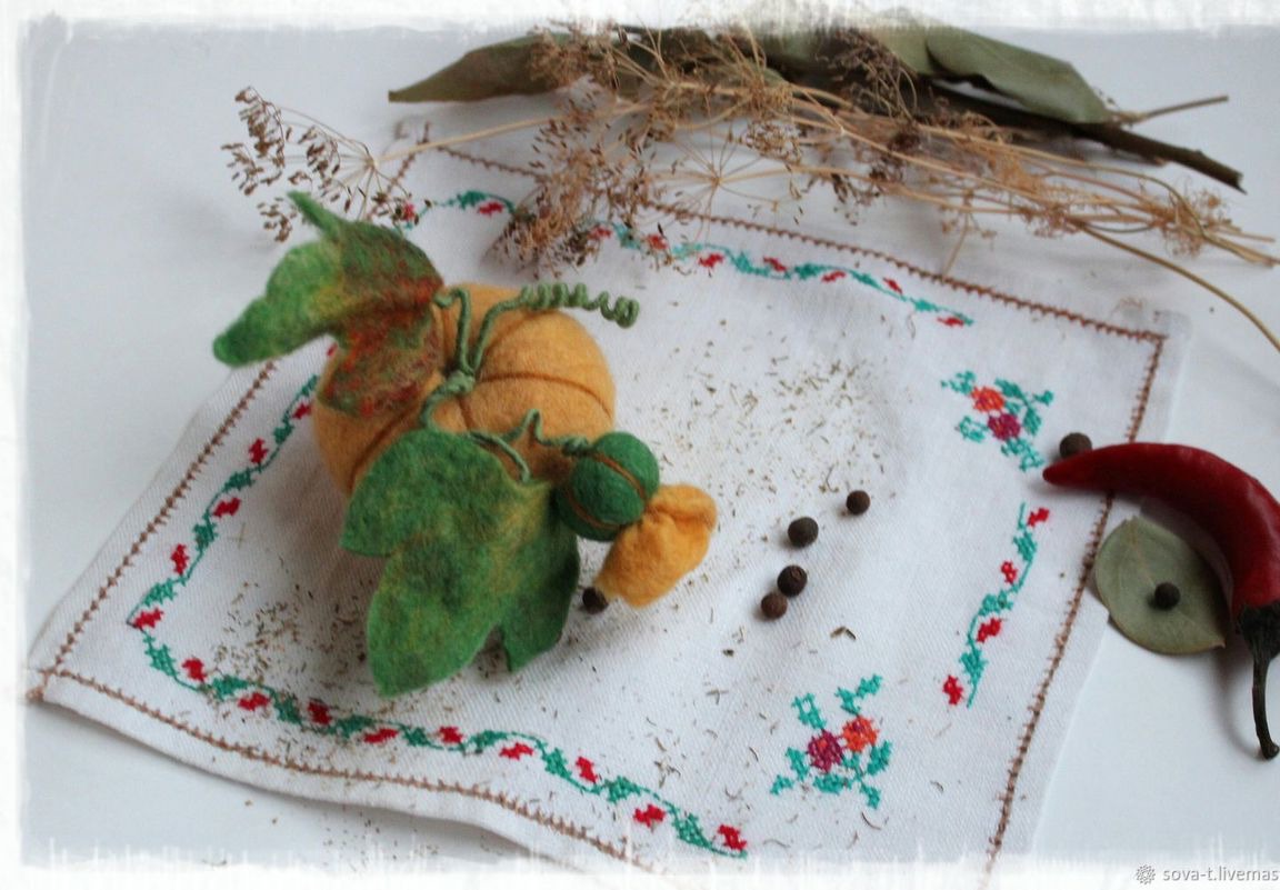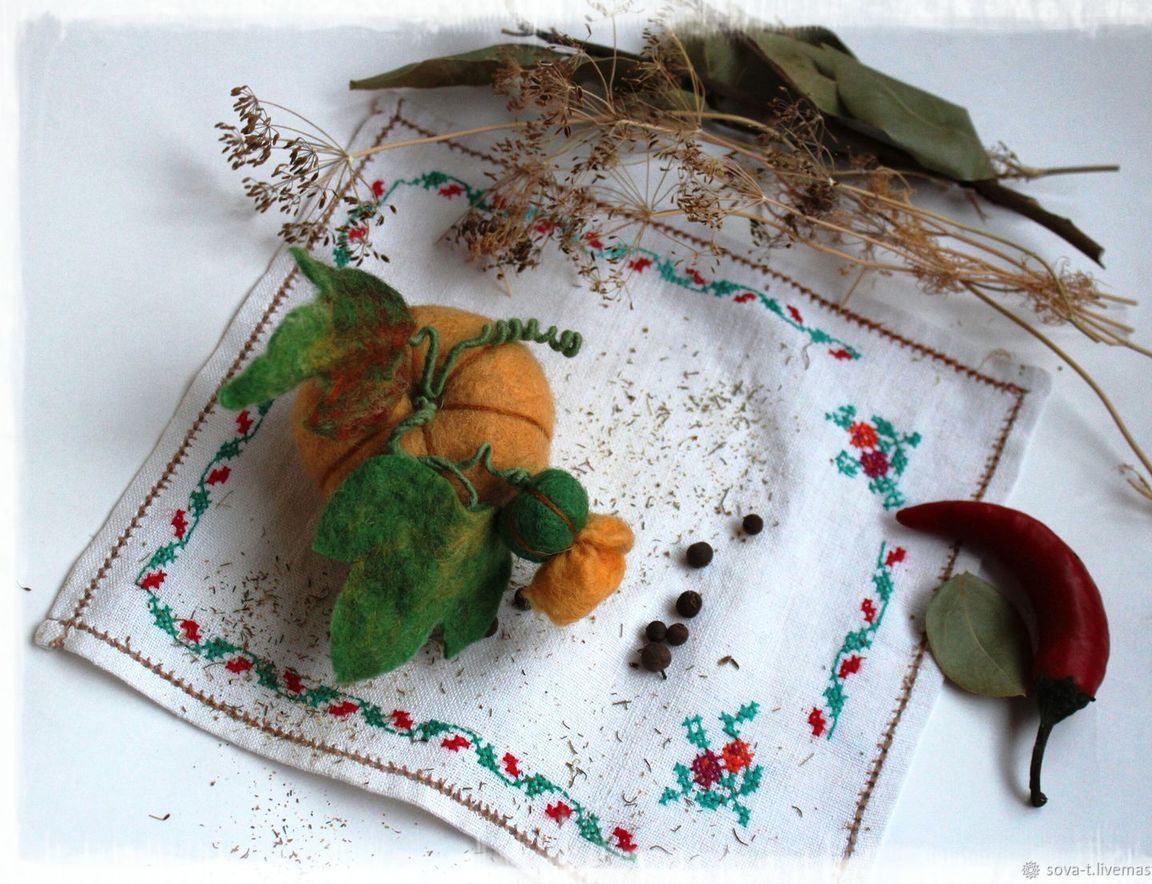 Игольница-тыковка выполнена из шерсти для валяния, украшена валяными листика, цветком и усиками в которых основа проволока, а значит можно задать ей любое направление.