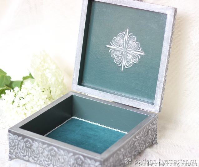 Дно выложено итальянским велюром на натуральной основе цвета морской волны и отделано серебряным шнуром.