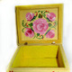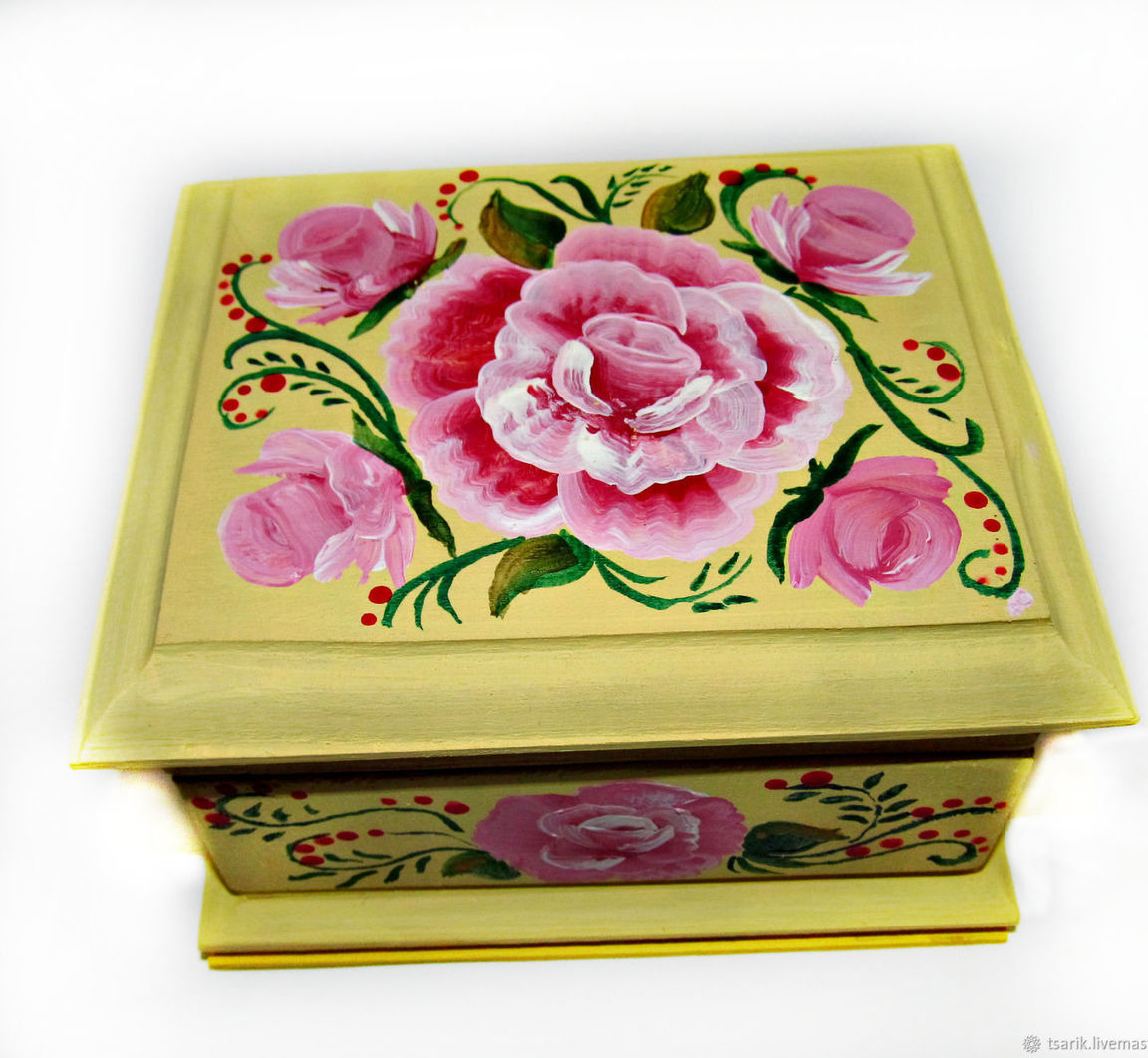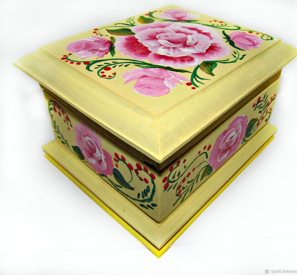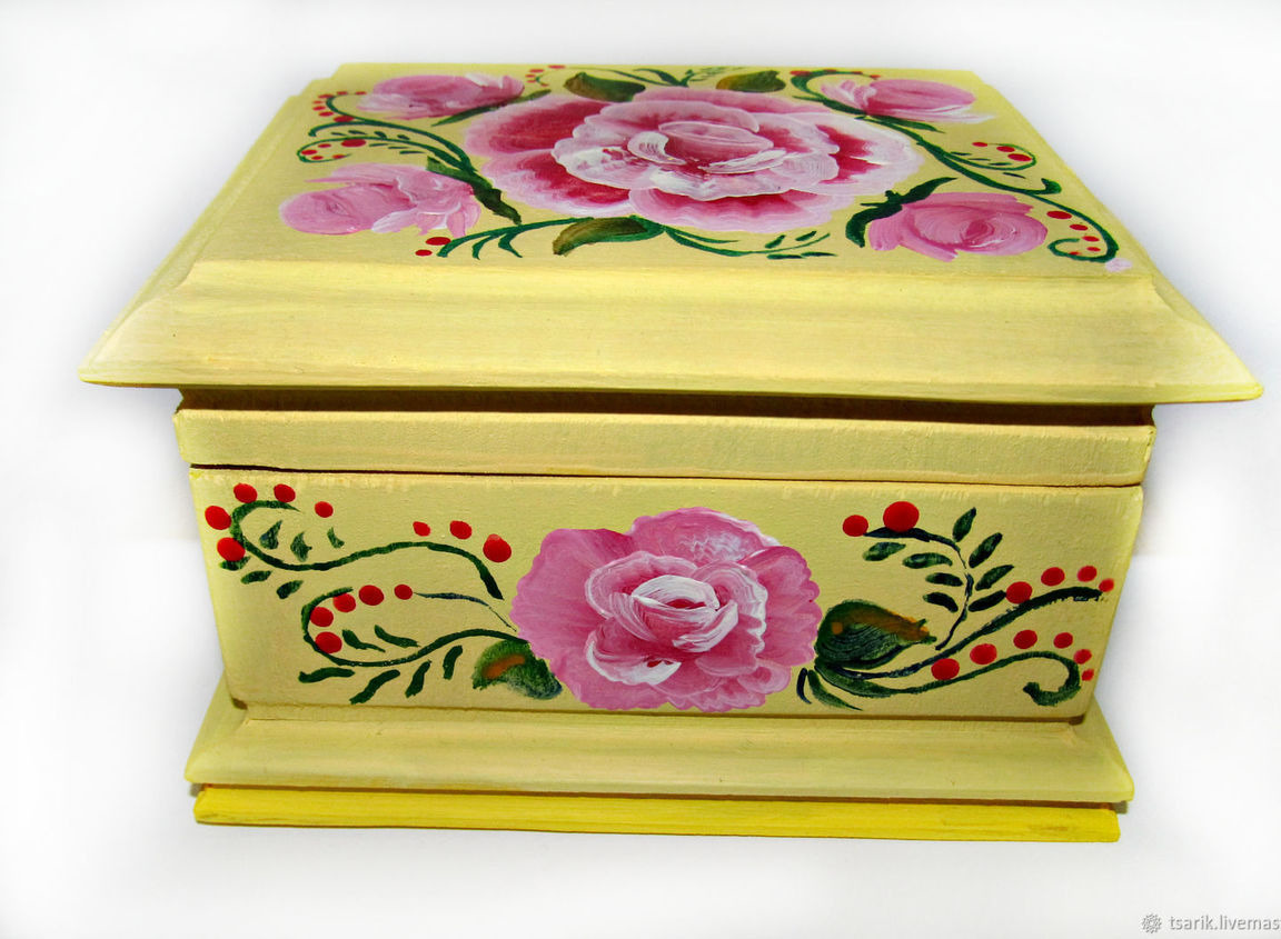 Небольшого размера шкатулка выполнена в технике ручной росписи акриловыми красками. На нежно-желтом фоне цветочные мотивы. Эта шкатулка станет приятным для глаз украшением интерьера комнаты, дамского уголка. Предназначена для хранения разных мелочей, бижутерии.Внутри мягкая отделка фетром, внутренний размер 110/100/50
