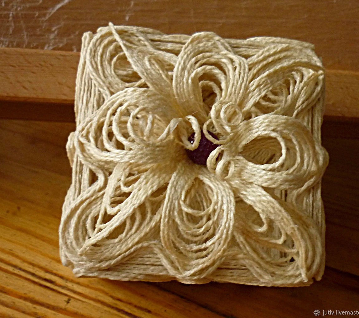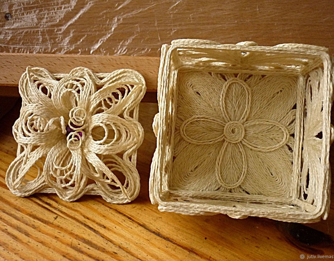 Шкатулка из отбеленного натурального джутового шпагата выполнена в технике джутовой филиграни.Размеры: 9*9,5 см, высота 7,5см. Цвет светло-светло - бежевый, золотистый, возможно отличие от оригинального. Можно использовать для хранения украшений или заколок.