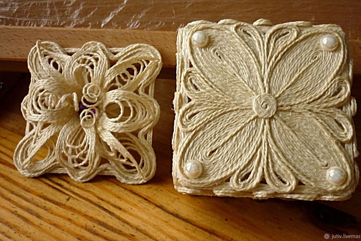 акриловый лак, джутовый шпагат, полубусины, стразы, клей пва