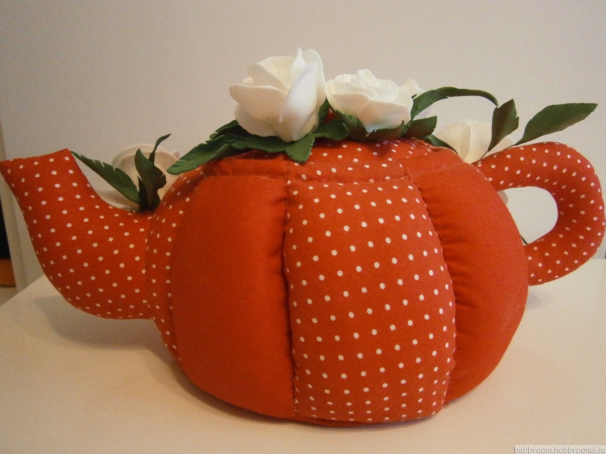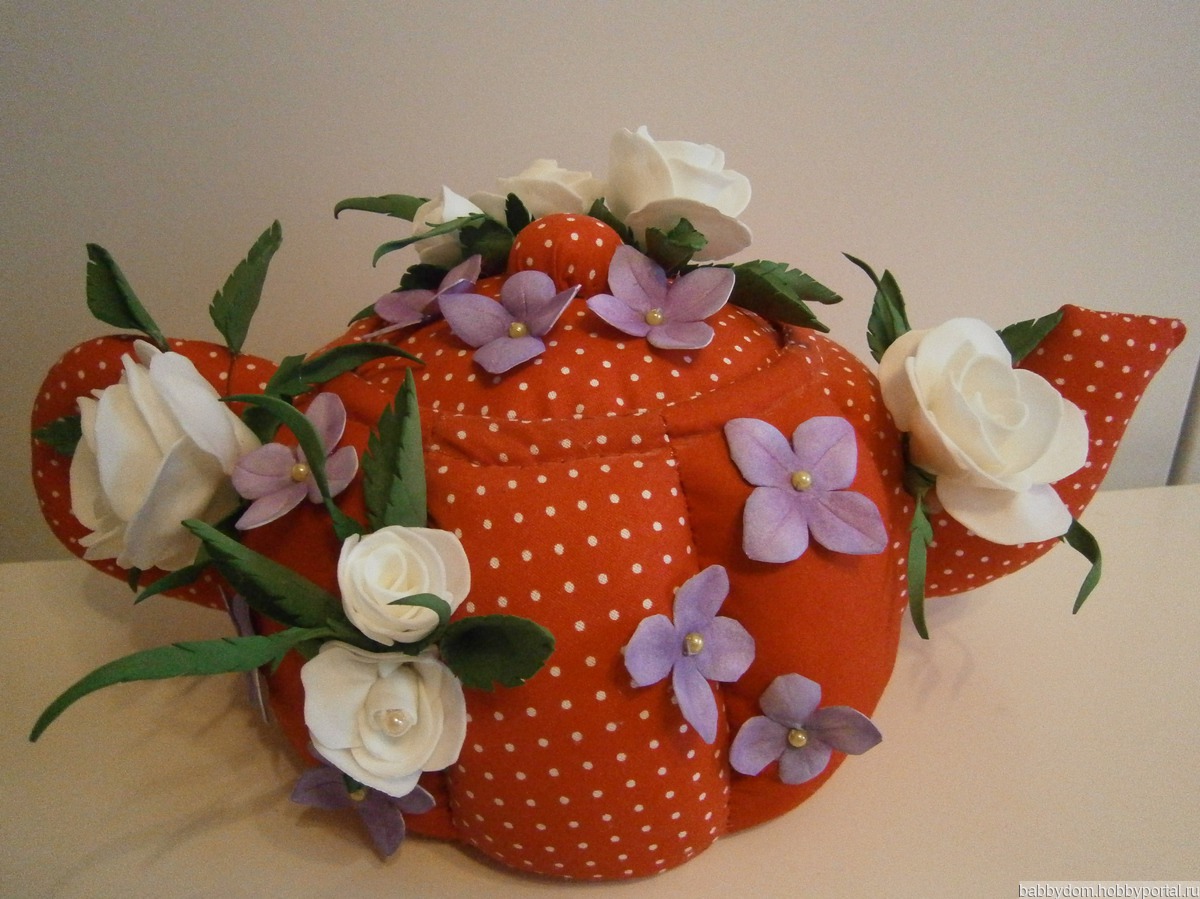 Текстильная шкатулка в виде чайника из х/б ткани,украшена цветами из фоамирана