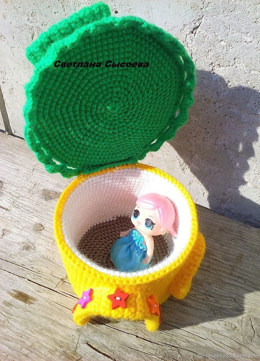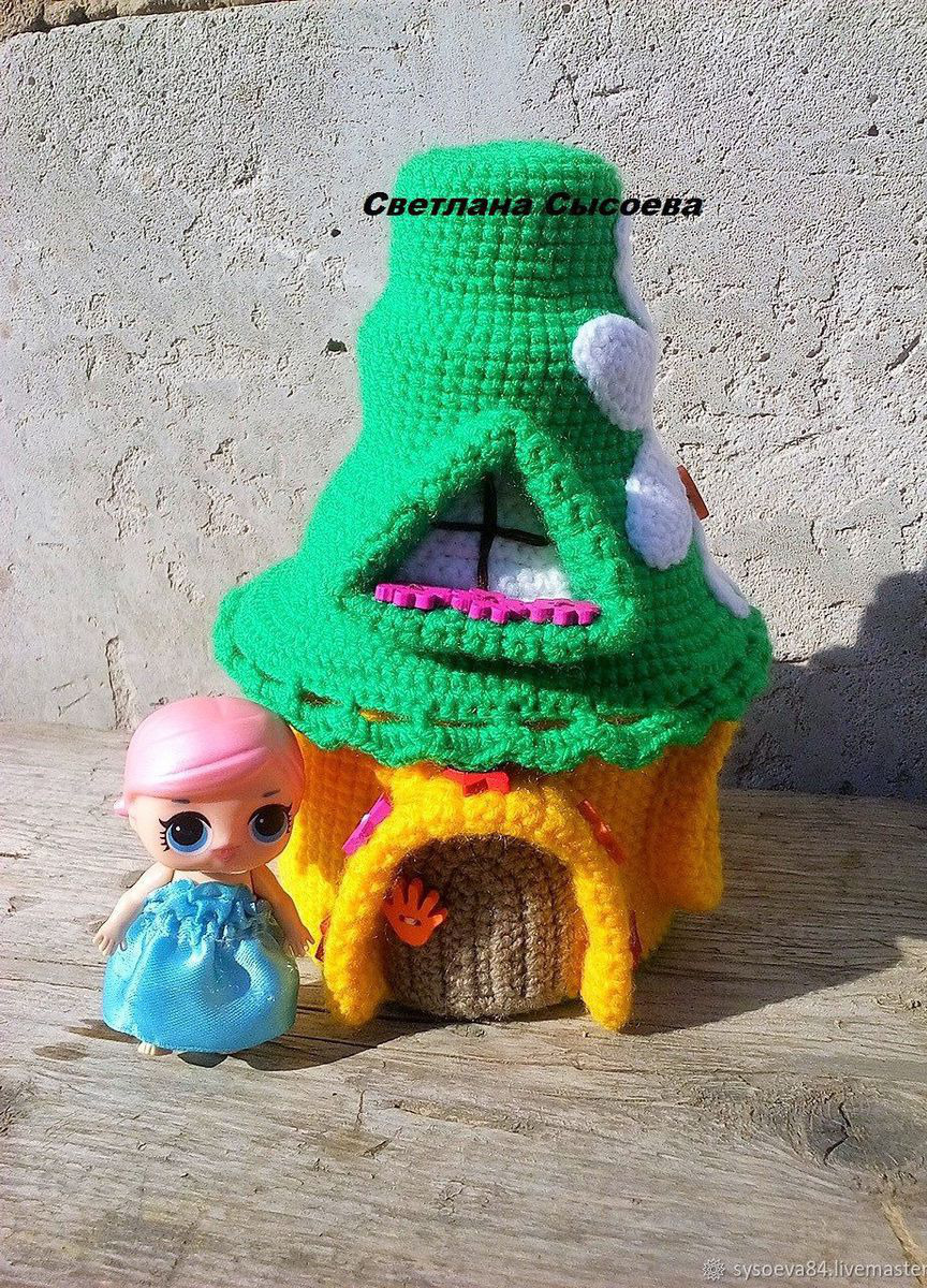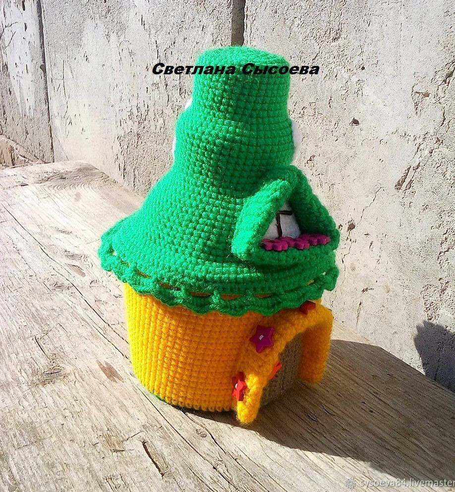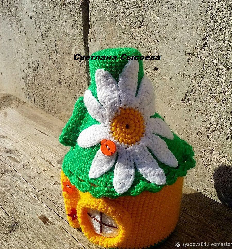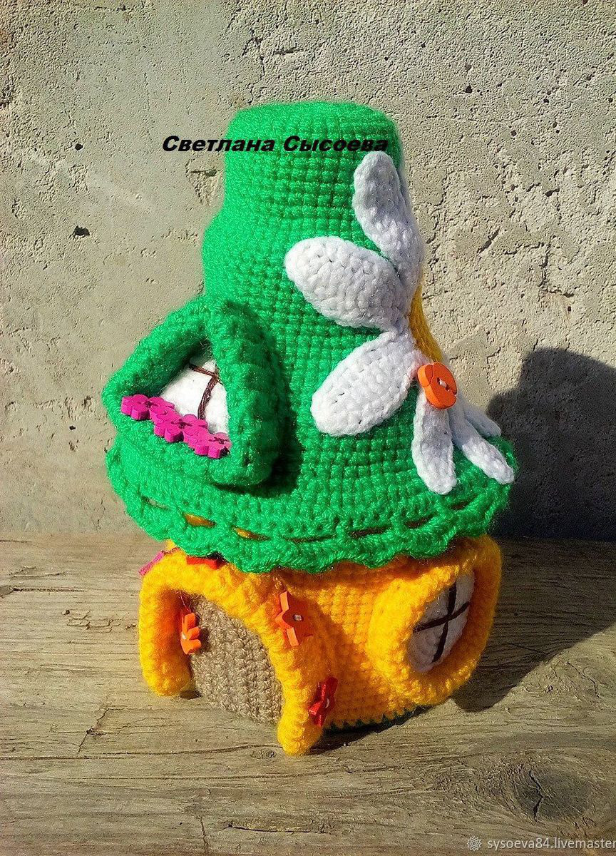 Высота домика 20 см, окружность - 35 см, диаметр 12см. Материалы: детская акриловая пряжа, пуговицы, пластиковый каркас.
