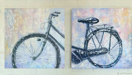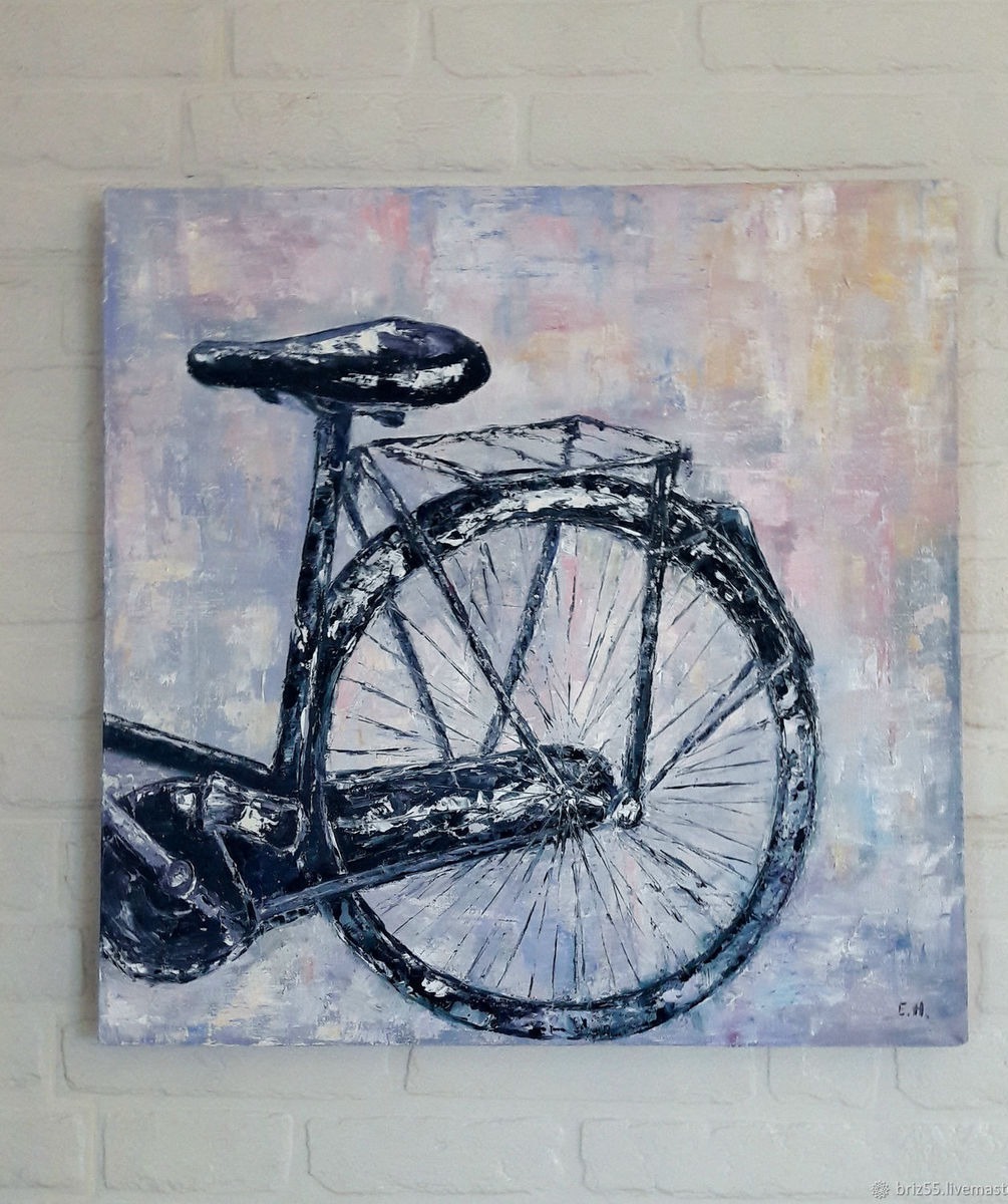 голубой, синий, комбинированный, картина для интерьера, картина в подарок, холст, велосипед, картина маслом, Масляная живопись, живопись маслом, лофт, живопись мастихином, масло, модульная картина
