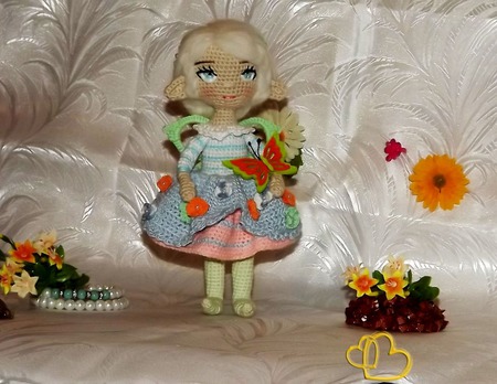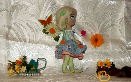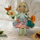 Маленький цветочный эльфик, очень нежный и светлый, принесет радость каждому , кто возьмет его в руки , принесет лучик солнышко в ваш дом. Платьице не снимается , куколка каркасная, прическа не меняется, не рекомендую для маленьких деток.