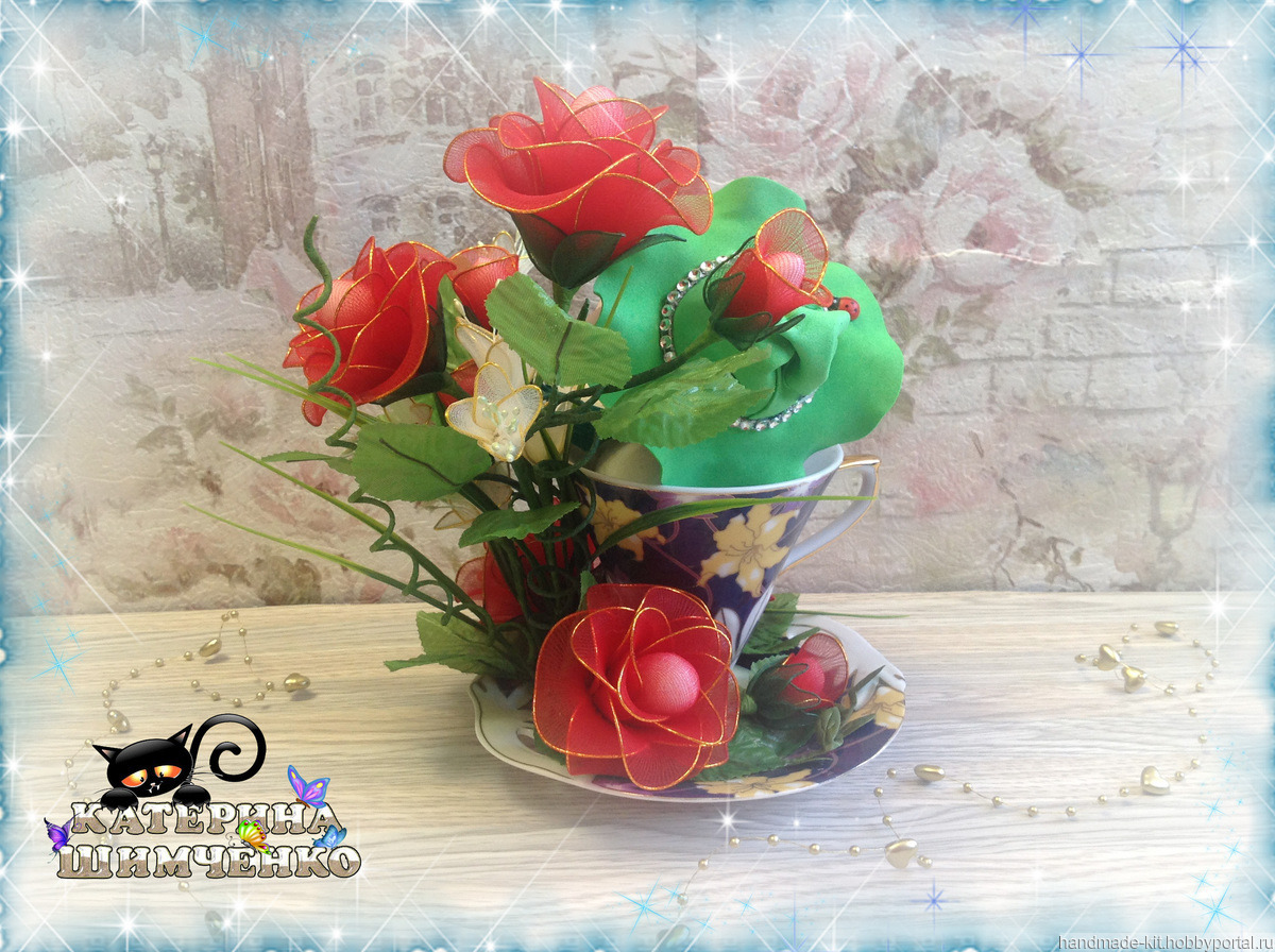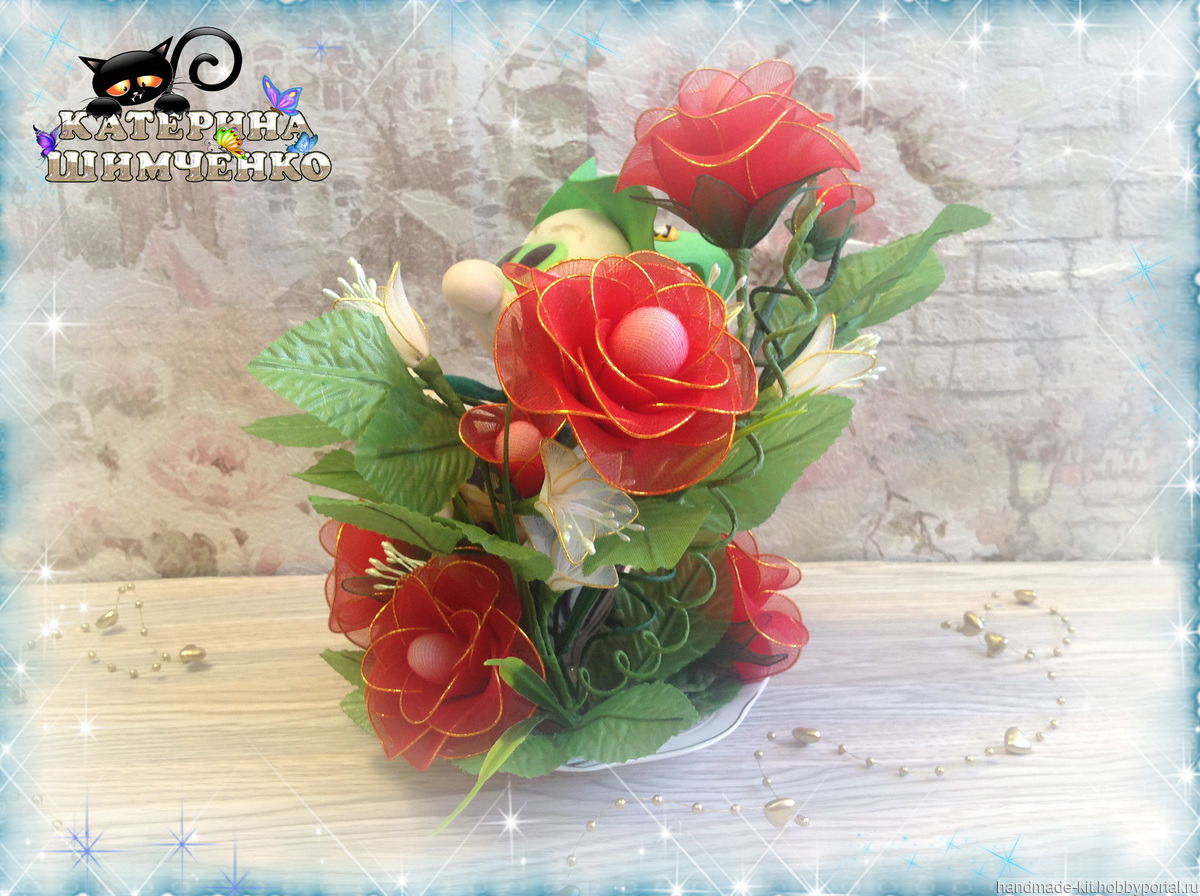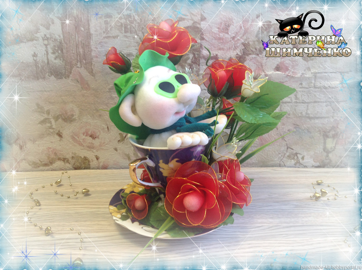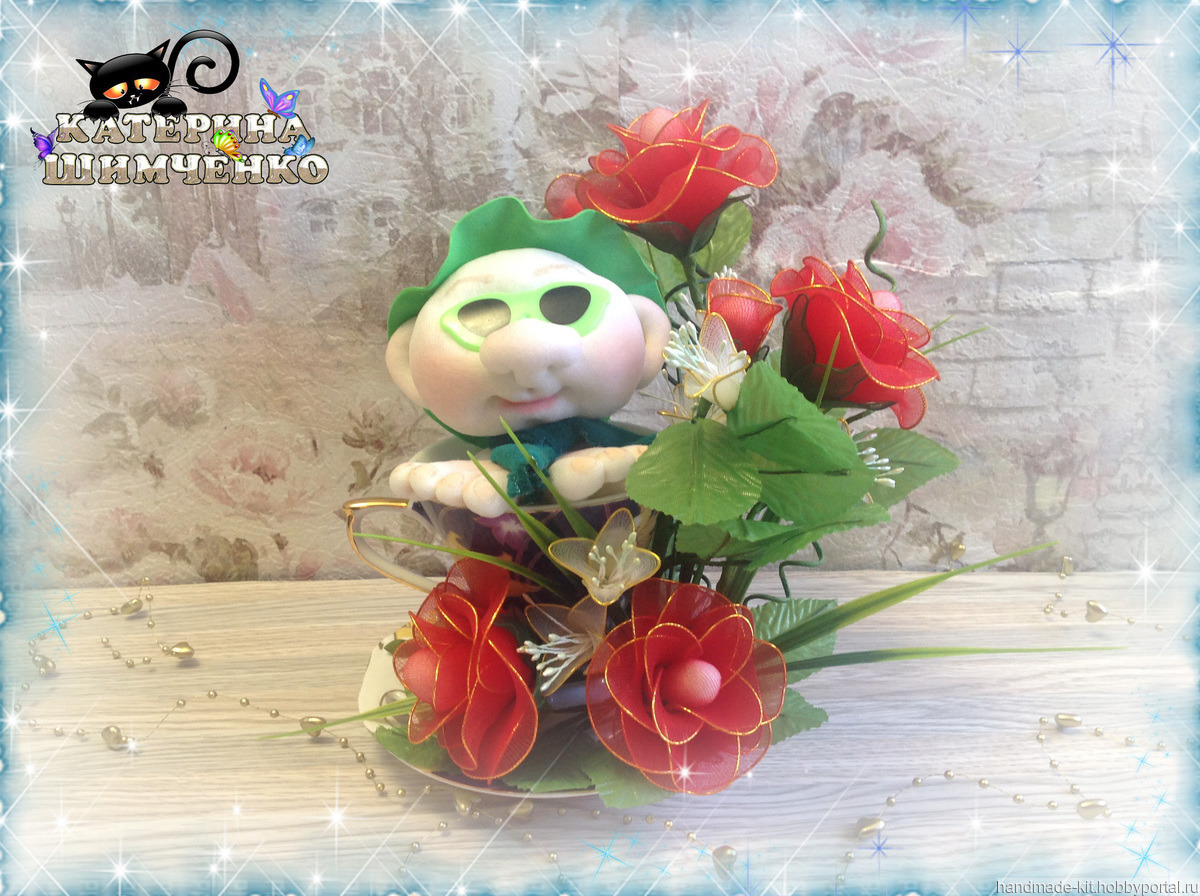 Композиция состоит из чайной кружки, в которой сидит милый гномик, а рядом расположены 5 роз, 4 розовых бутона и 8 цветов мелкоцвета. За счёт проволочного каркаса лепесткам, стеблю и листьям можно придавать любой изгиб.