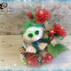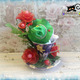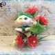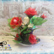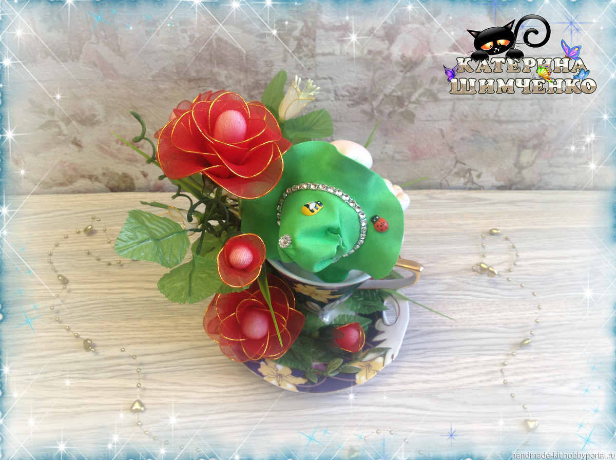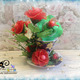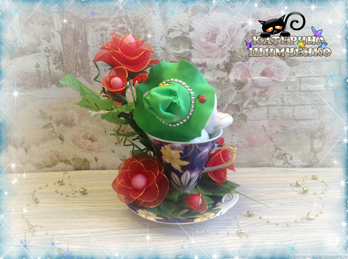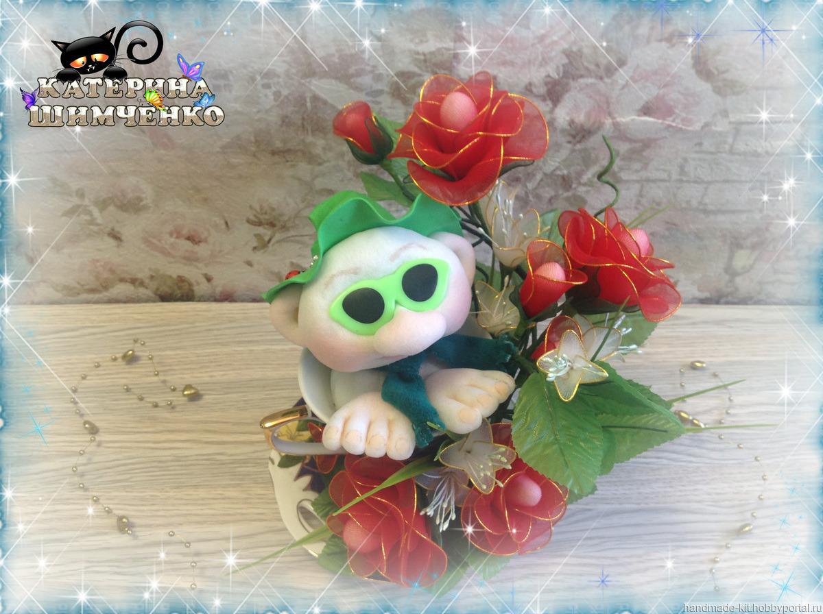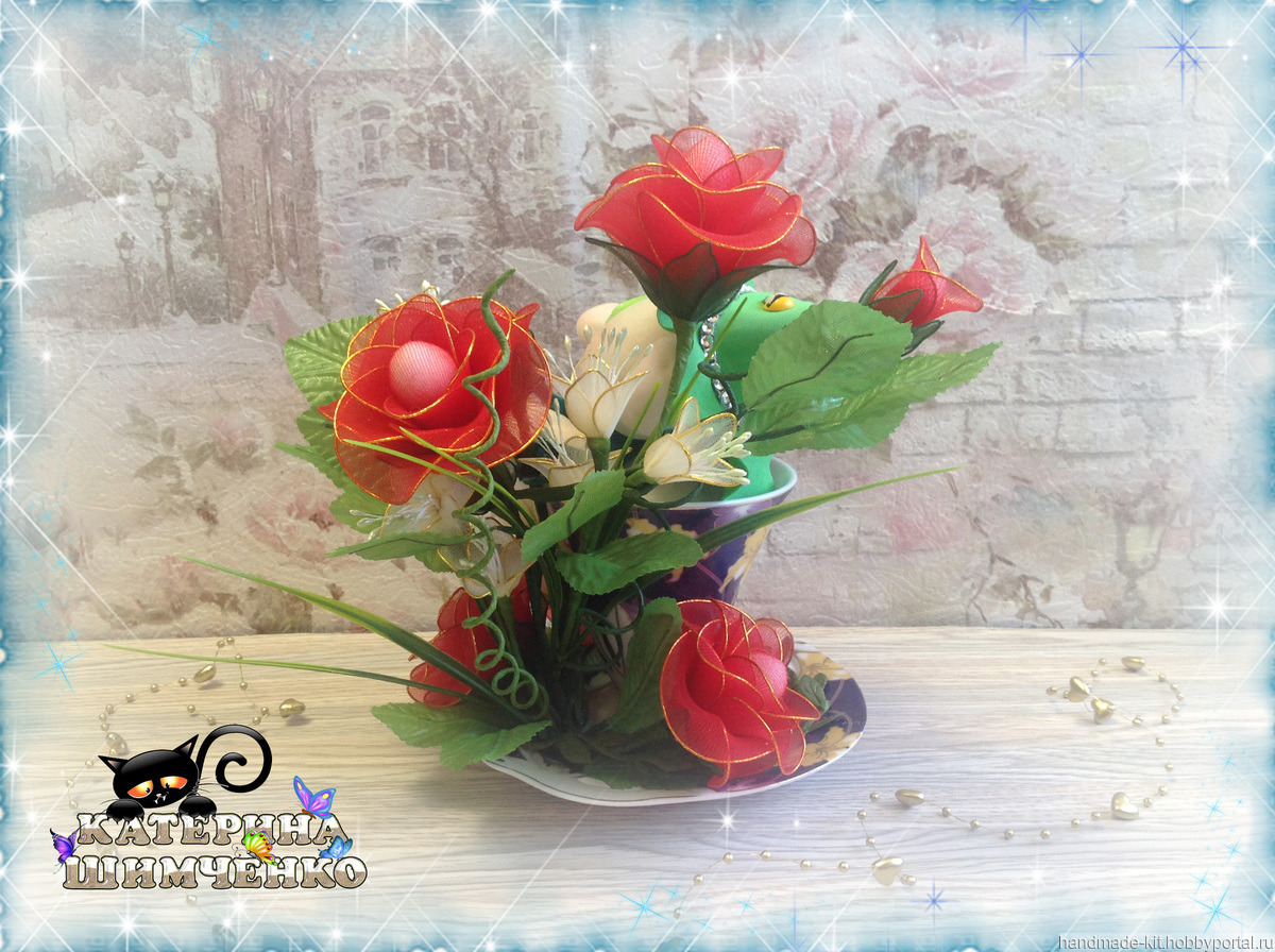 Композиция состоит из чайной кружки, в которой сидит милый гномик, а рядом расположены 5 роз, 4 розовых бутона и 8 цветов мелкоцвета. За счёт проволочного каркаса лепесткам, стеблю и листьям можно придавать любой изгиб.