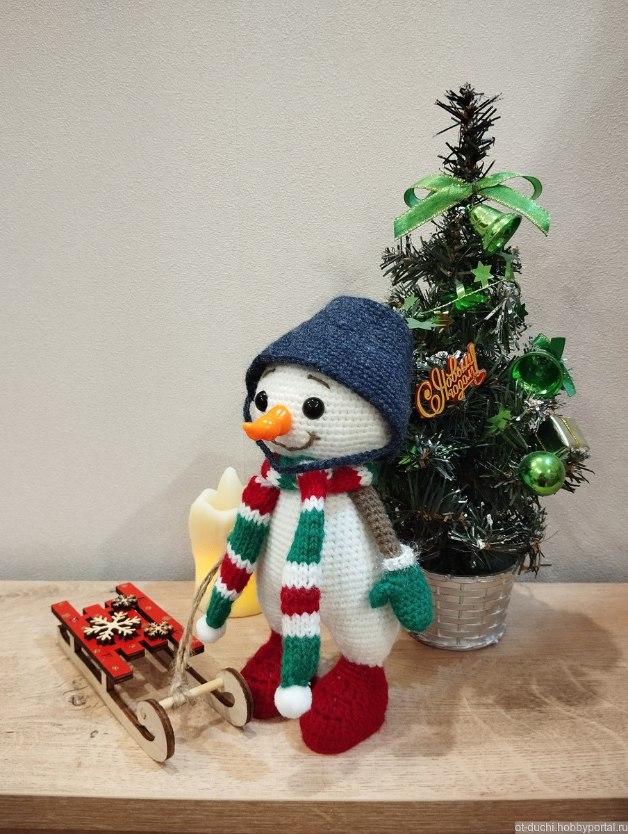 Весёлый снеговик связан для вас. Он дополнит праздничный интерьер вашей комнаты и послужит отличным подарком для ваших близких
