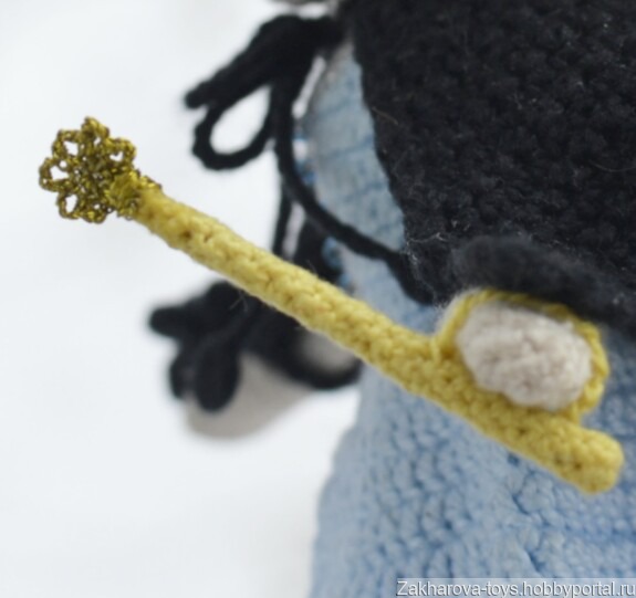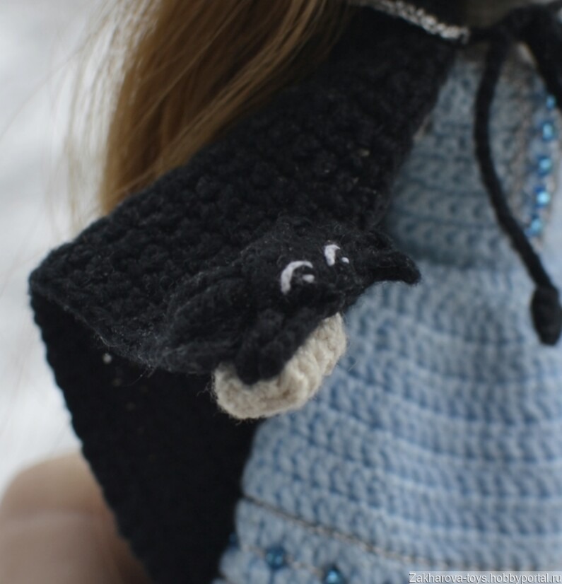 Рост 16 см без шляпы. Связана крючком из 100% хлопка. Волосы искусственные. Лицо вышито. Внутри каркас. Куклу можно зафиксировать в любом положении. Одежда (шляпа, накидка, платье, туфли) снимается. Волшебная палочка на петельке. Маленький паучок на магните. В руках у куклы также магниты.