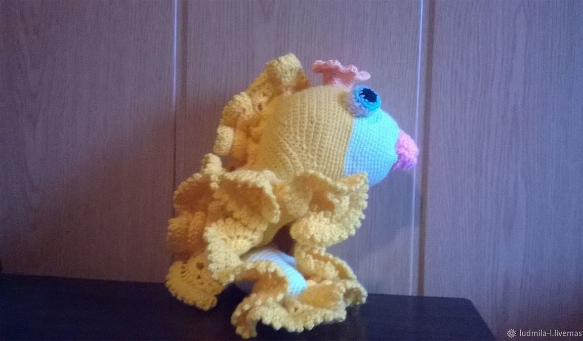 Вязаная игрушка Золотая рыбка связана крючком из акриловой пряжи. Плавники выполнены ажурным узором.