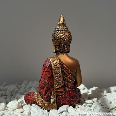 Фигура Будда в классической позе лотоса источает мощную энергию умиротворения. Каждый изгиб тела, от идеально ровной спины до сложенных в мудре рук, говорит о глубокой сосредоточенности и силе духа. Эффект состаривания мягко подчеркивает рельеф мышц, создавая живую, дышащую историей поверхность. Эту мощь согревает и смягчает насыщенный бордовый цвет мантии, ниспадающей мягкими, пластичными складками. Сочетание прохладного металлического блеска и глубокого теплого бордо создает невероятно гармоничный и стильный дуэт, который будет притягивать восхищенные взгляды.