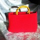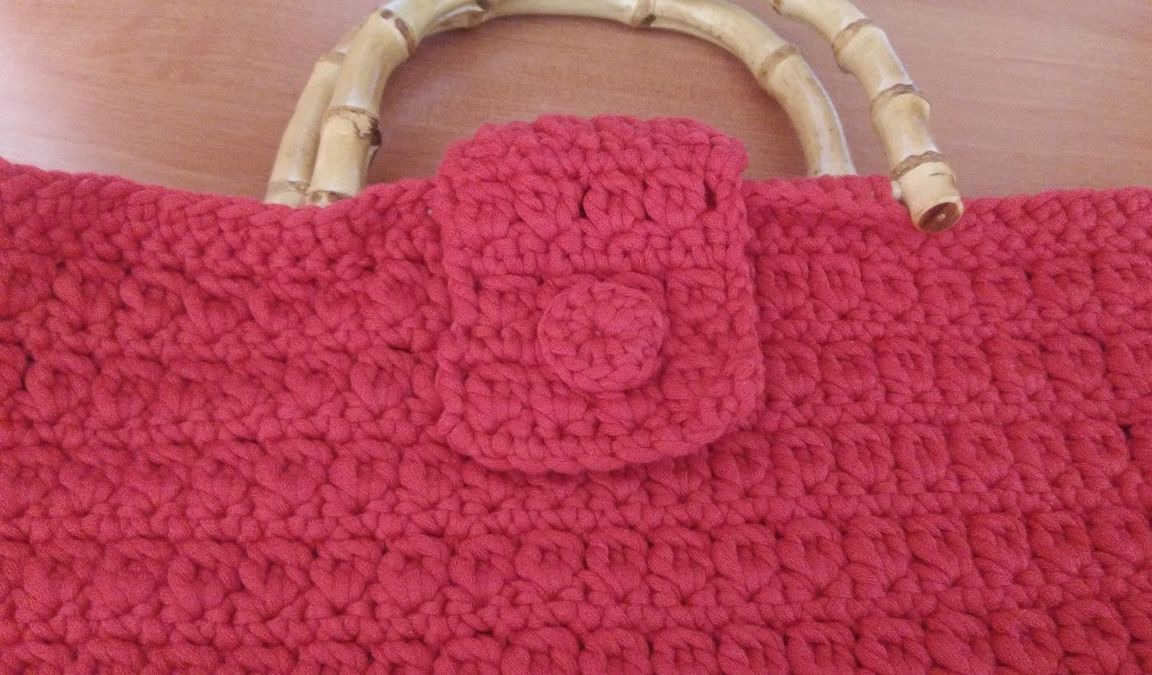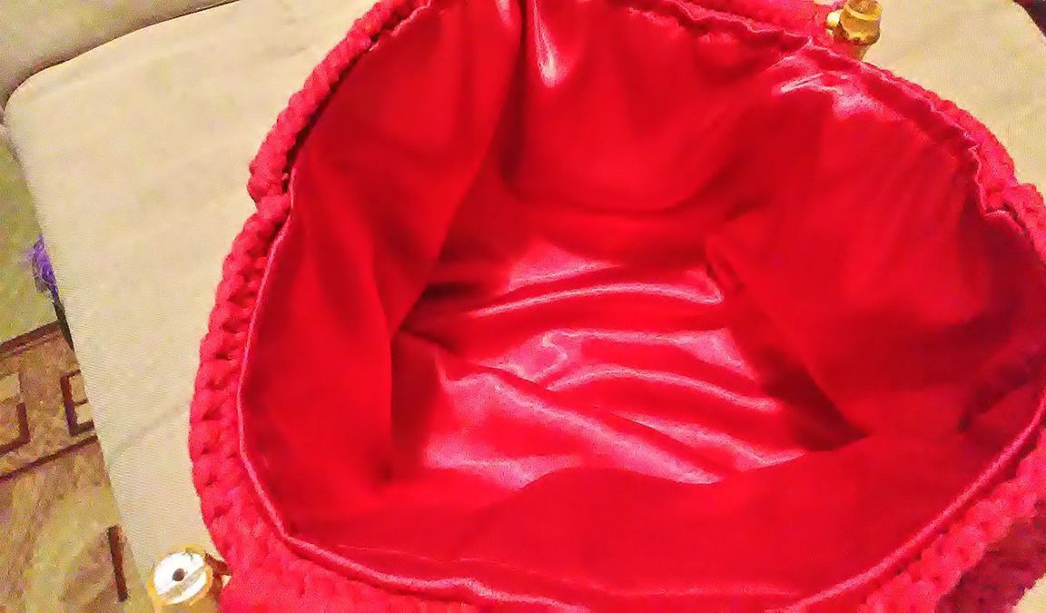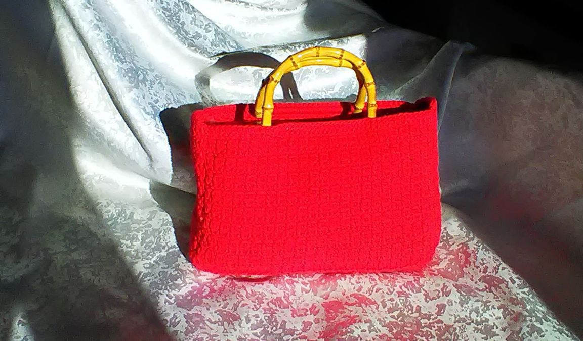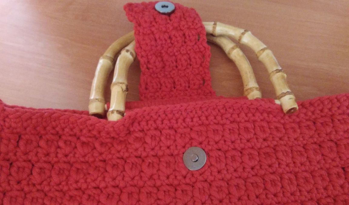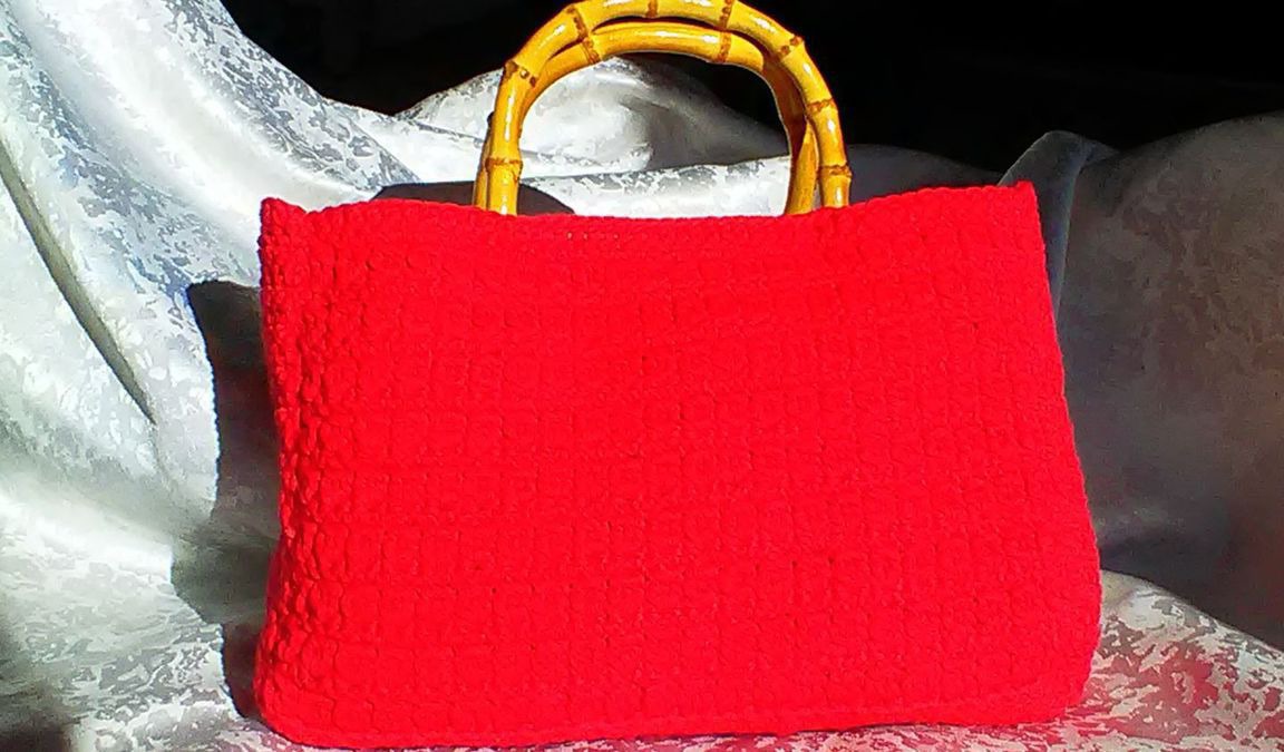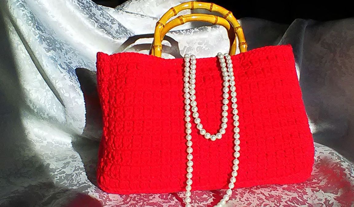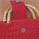 Удобная вместительная сумка "Искра" привлекает внимание ярким красным цветом и интересной фактурой вязки, особое очарование этой милой сумочке добавляют натуральные бамбуковые ручки, ввязанные в основную часть сумки. У сумки подклад из атласной ткани и магнитная кнопка-застежка.