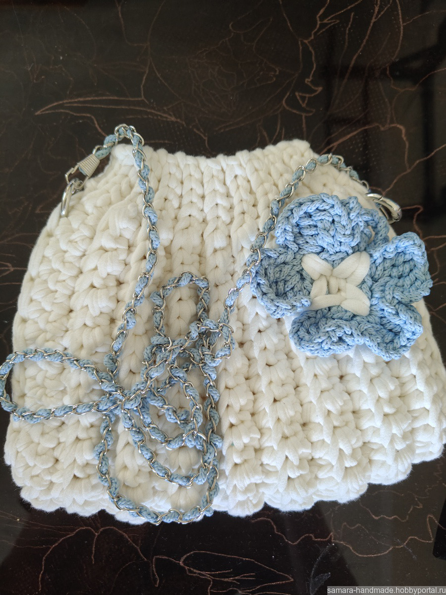Сумка ручной работы из трикотажной пряжи. Размер 16 см на 19 см. Ручка-цепочка 50 см. Можно использовать в качестве клатча или косметички.
