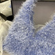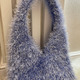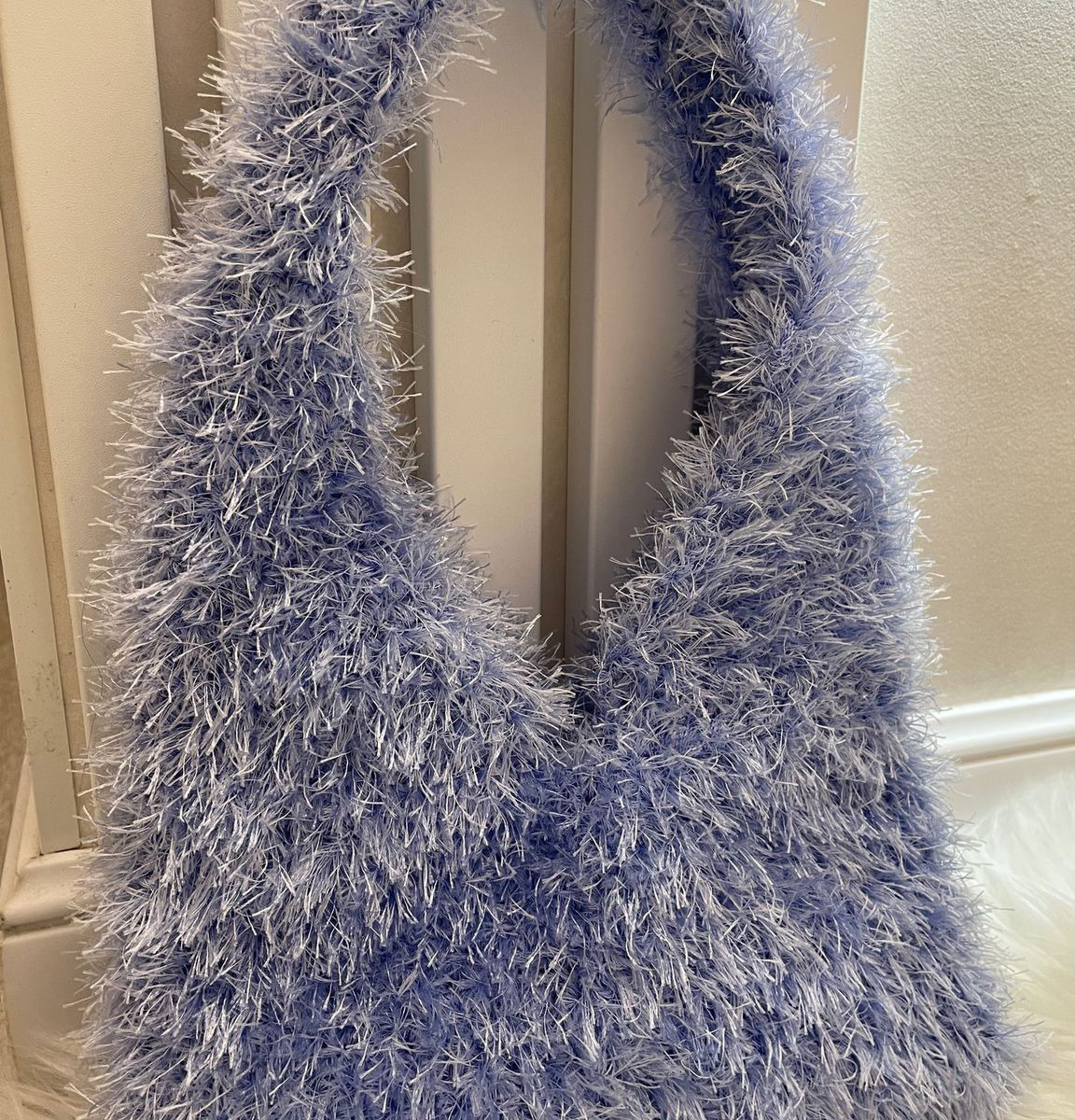 В наличии вязаная пушистая сумка бело-голубого цвета. Связана из пряжи травка. Размеры: ширина 23 см, высота 12 см (вместе с ручкой 34 см). Можно заказать в любом другом цвете.