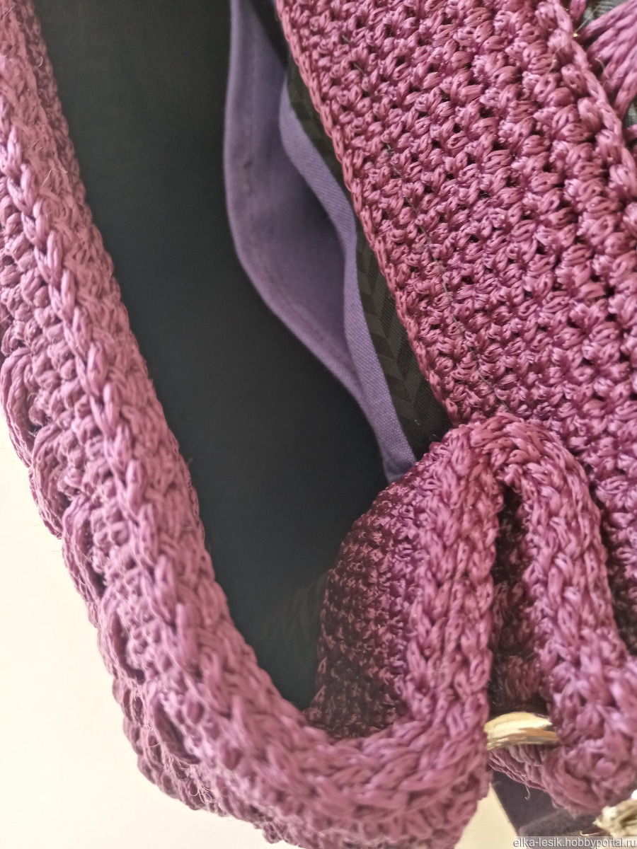 Вместительная сумка связана из полиэфирного шнура фиолетового цвета. Внутри подклад с прорезным карманом. Укреплённое дно сумки имеет 4 ножки. Высота 24 см. По дну размеры 28 на 14 см. Клапан, ремешок и дно из качественной эко кожи. Удобен поворотный замок. Можно носить как в руке, так и через плечо.