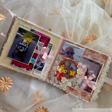 Детский фотоальбом ручной работы. Размер 21/21/5, вмещает более 40 фото разного размера. Все странички украшены вырубкой, кружевом, лентами и бусинками, Подложки под фото закрываются на магниты. Работа представлена для примера. Дизайн страничек согласовывается индивидуально