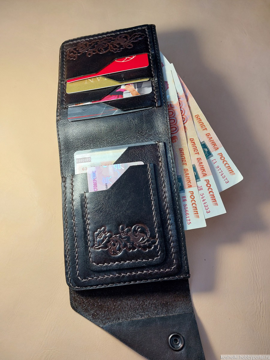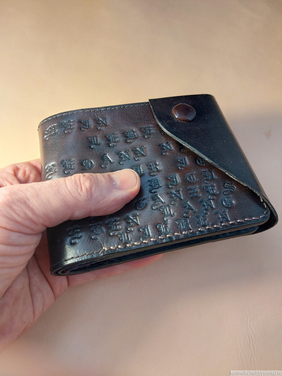 Мужской кошелек с тиснением ,хороший подарок для мужчины ,надпись на немецком языке о признании в любви, кошелек коричневого цвета, вместительный ,для банковских карт (4), автодокументов ,денежных купюр .Эта модель в единственном экземпляре, выполнена из кожи. Мягкий.