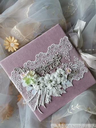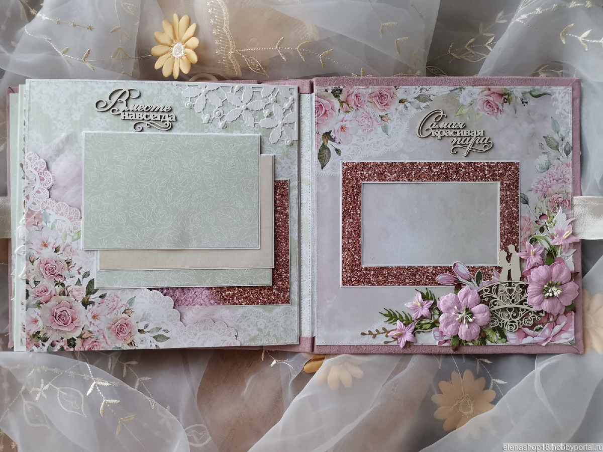 Свадебный фотоальбом ручной работы выполнен в нежных розовых тонах. Размер 23\23/5. Тематические странички оформлены вырубкой, кружевом , надписи-чипборд. Вмещает альбом более 40 фото размером 10/15. Дизайн страничек и обложки согласовывается индивидуально. Обложка выполнена из итальянской замши,завязывается альбом на ленты.