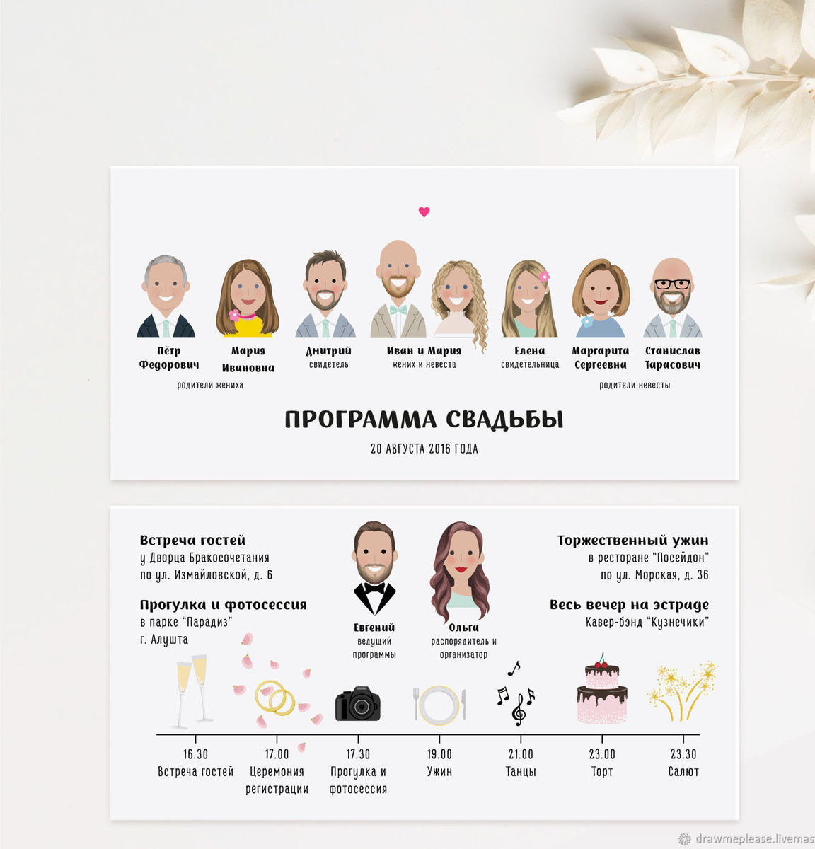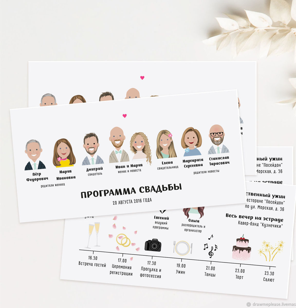 свадебные приглашения, приглашения на свадьбу, свадебные пригласительные, пригласительные на свадьбу, программа свадьбы, программа на свадьбу, иллюстрированная программа свадьбы, свадебная программа, программа свадьбы с портретами, свадебная полиграфия, полиграфия на свадьбу, программа на заказ, полиграфия на заказ