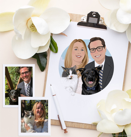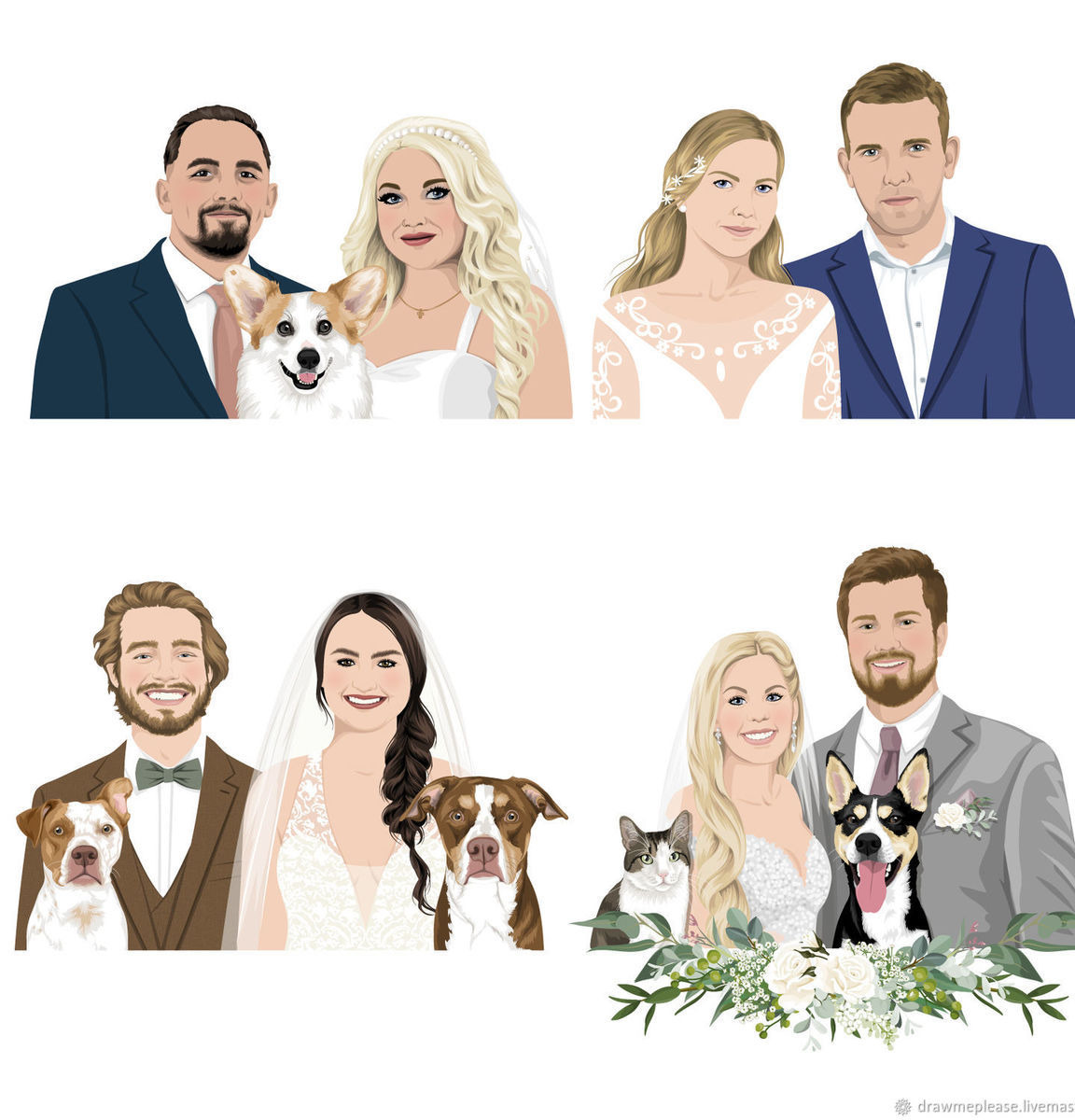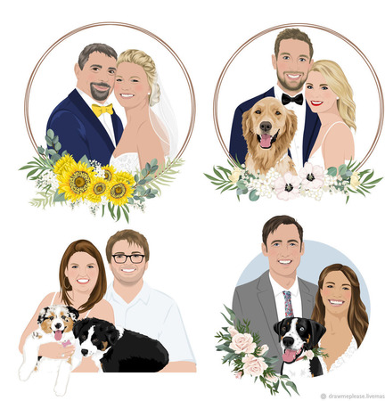 Указаная цена включает в себя два портрета - жениха и невесты. Вы можете заказать дополнительный портрет, если вы хотите добавить ваших домашних питомцев.