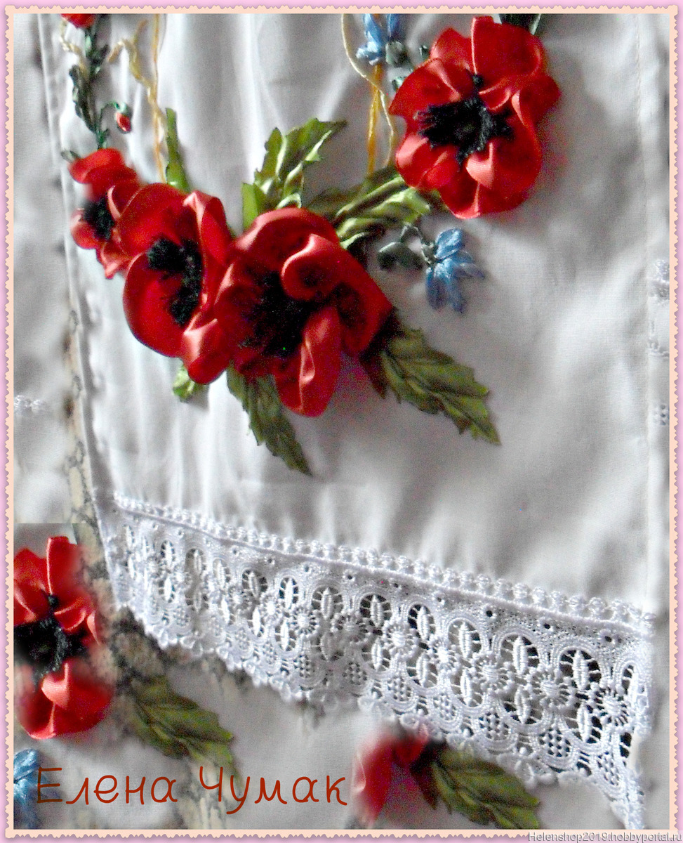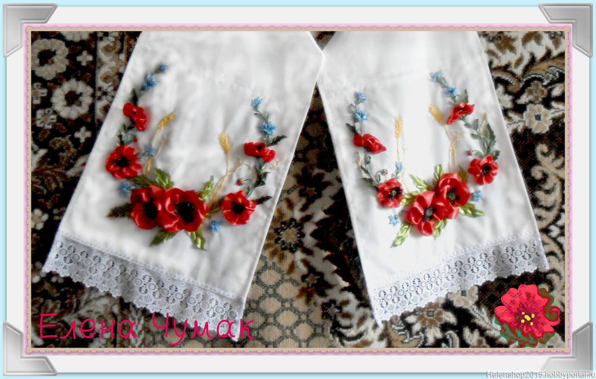 Рушник вышит на хлопчатобумажной ткани объёмными цветами атласными лентами , тонировка красками по ткани по готовой работе. Размер рушника 200 см Х 40 см.