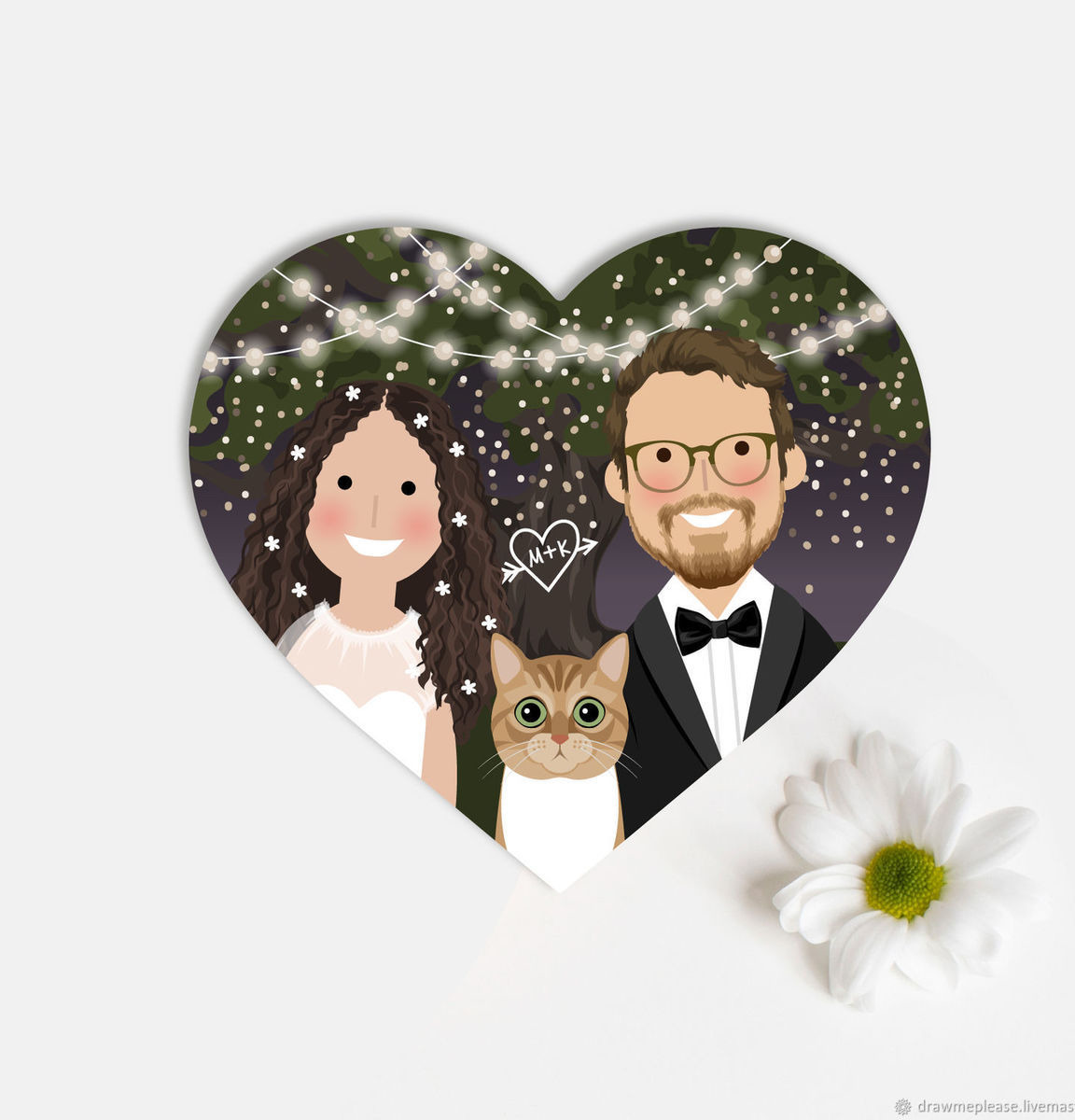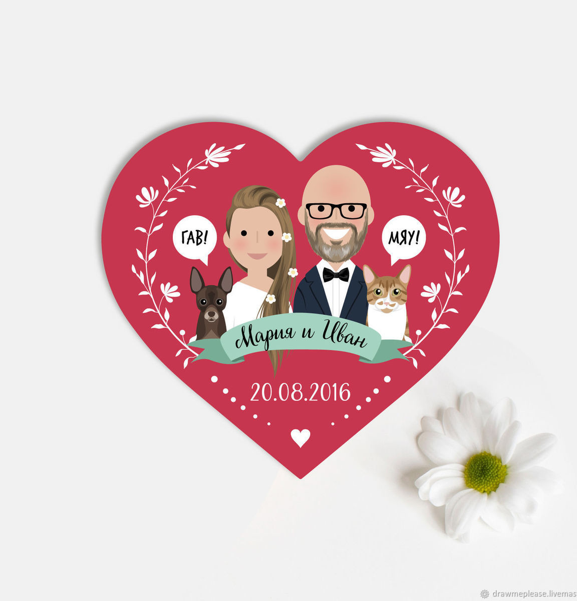 Указанная цена включает в себя два портрета - жениха и невесты. Вы можете заказать дополнительный портрет, если вы хотите добавить ваших домашних питомцев.