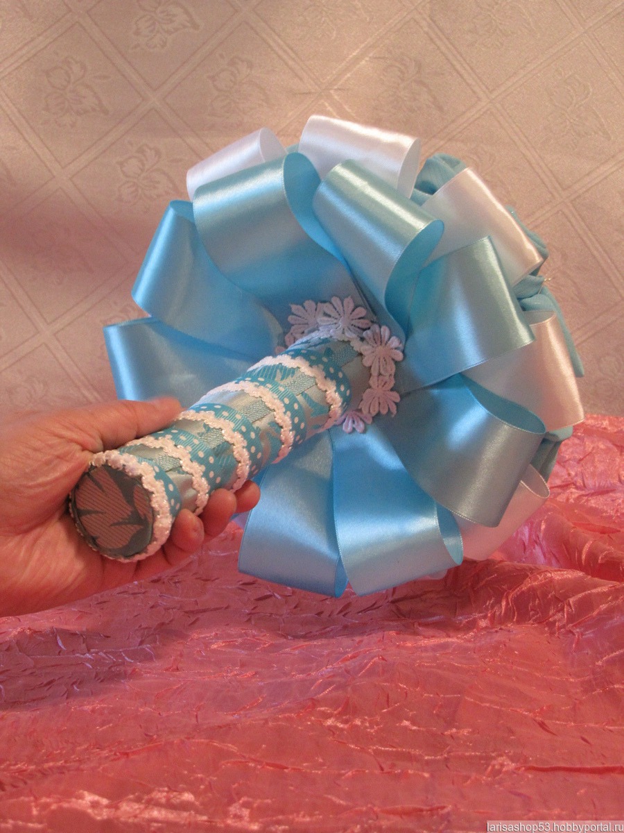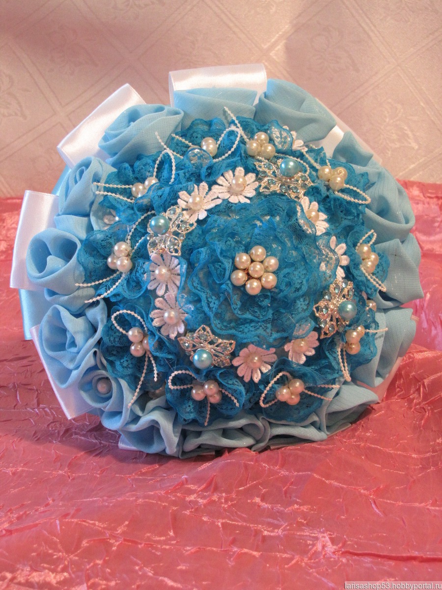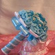 Букет-дублёр для невесты выполнен в бирюзовой гамме из шифоновых розочек, атласных лент, брошек и бусин. Дополнен кружевом и бисерной ниткой. Оригинальный и нежный букет, с удобной ручкой, лёгкий. Выполнен качественно и надёжно.