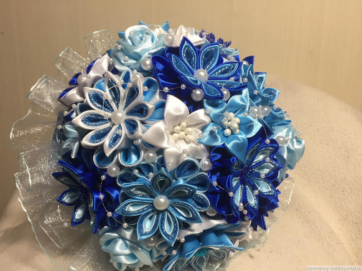 Букет невесты в стиле канзаши. Выполнен из атласных лент, кружева, страз