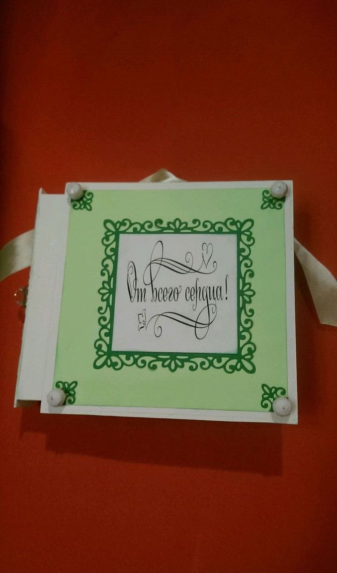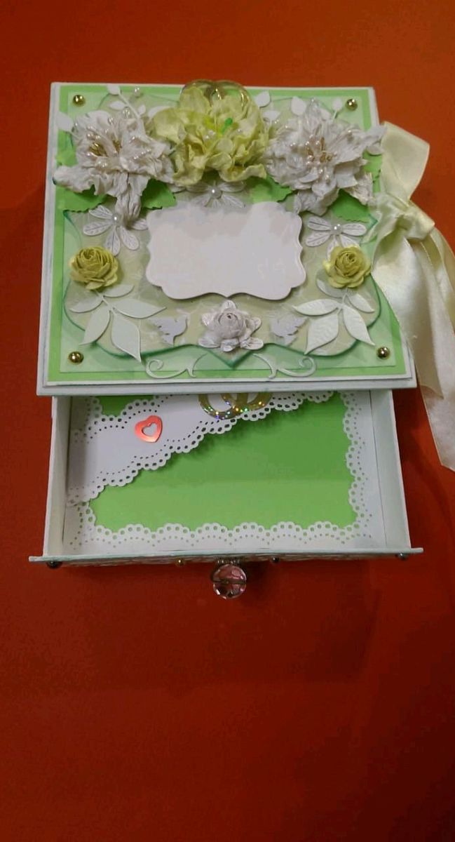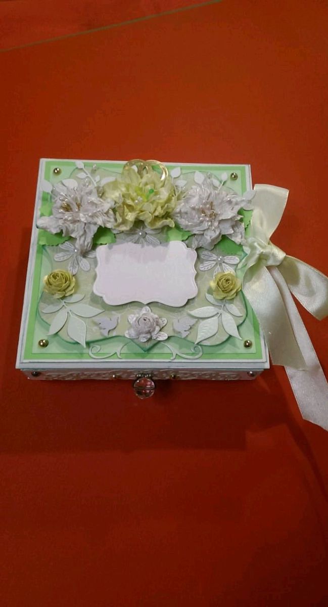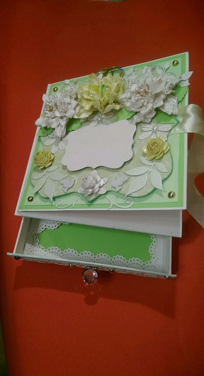 Свадебная Открытка - шкатулка ручной работы, выполнена в светло-зеленой и желтой гамме. Шкатулка - открытка подходит в качестве конверта и в дальнейшем может быть использована для украшений. Очень хорошо впишется в интерьер.