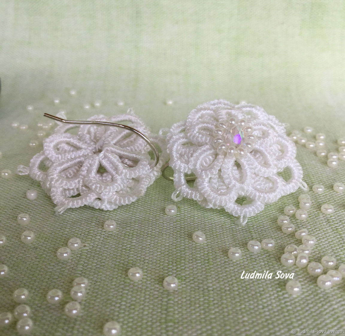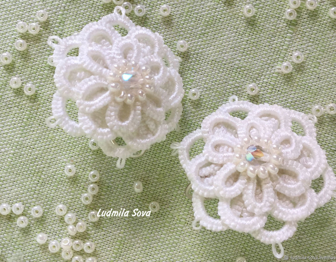 Эти серьги, сплетённые в технике фриволите-анкарс будут интересны невестам и тем, кто любит белый цвет в украшениях. В центре серег, в окружении белого бисера, как будто сверкает льдинка и привлекает внимание к своей хозяйке. Серьги сделаны с добавлением чешского бисера и бусин.