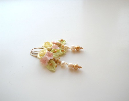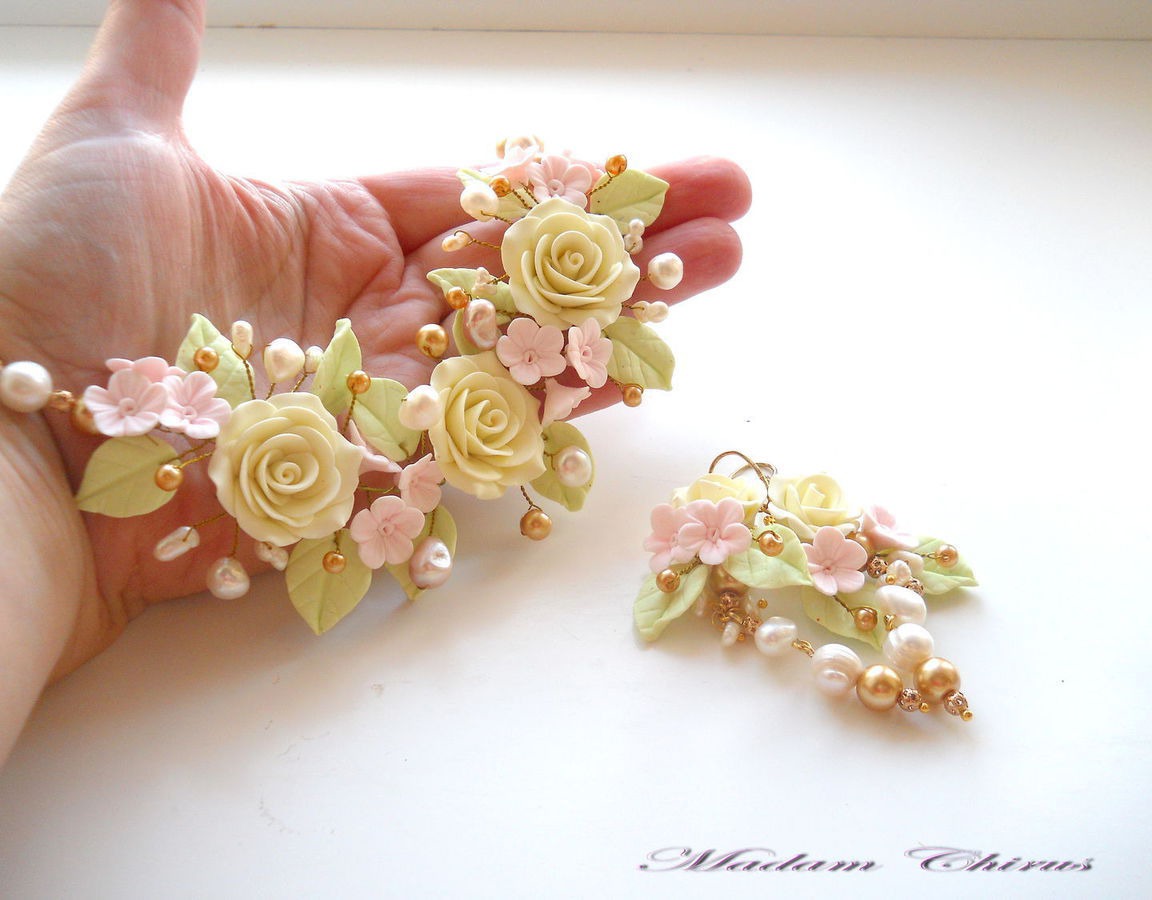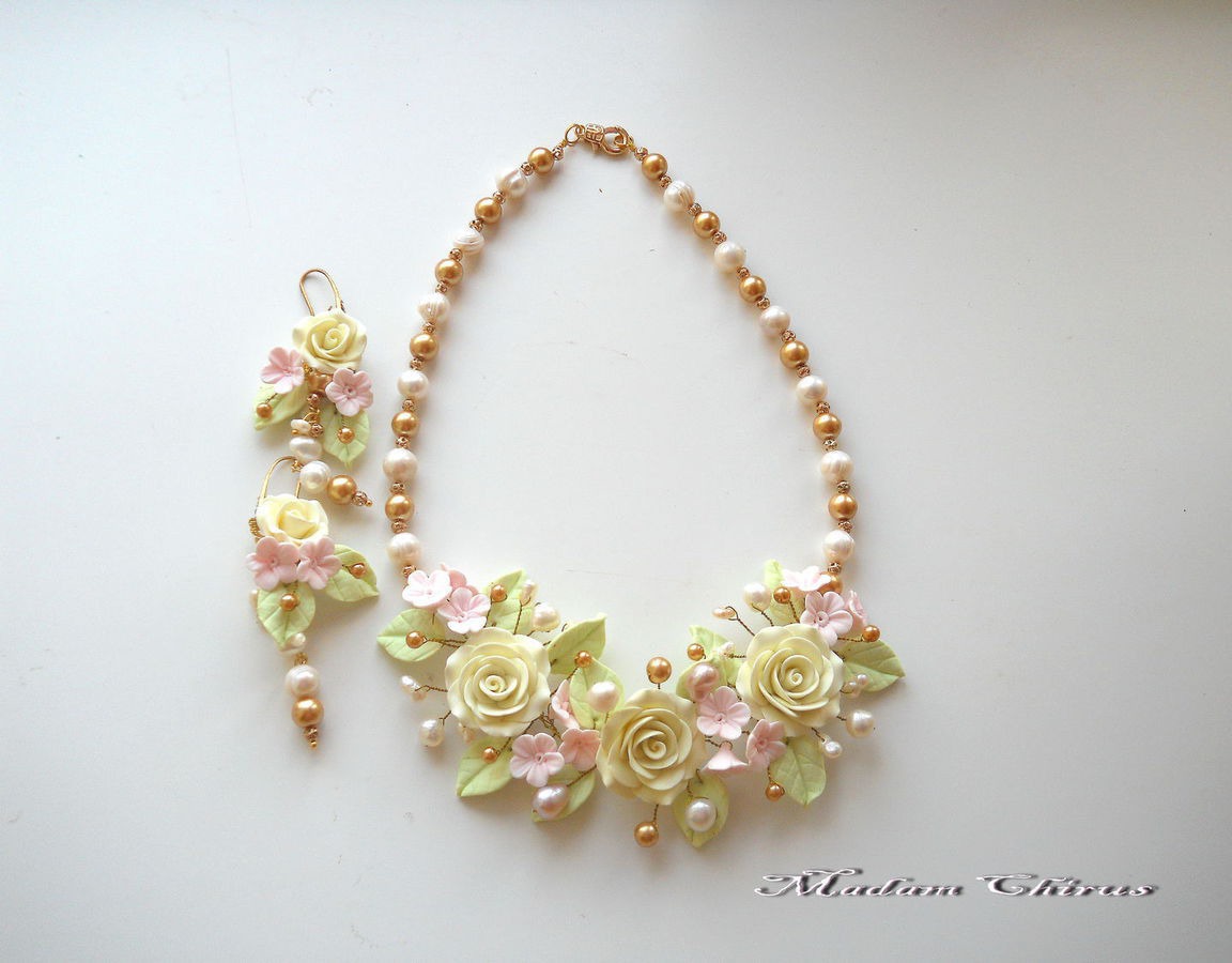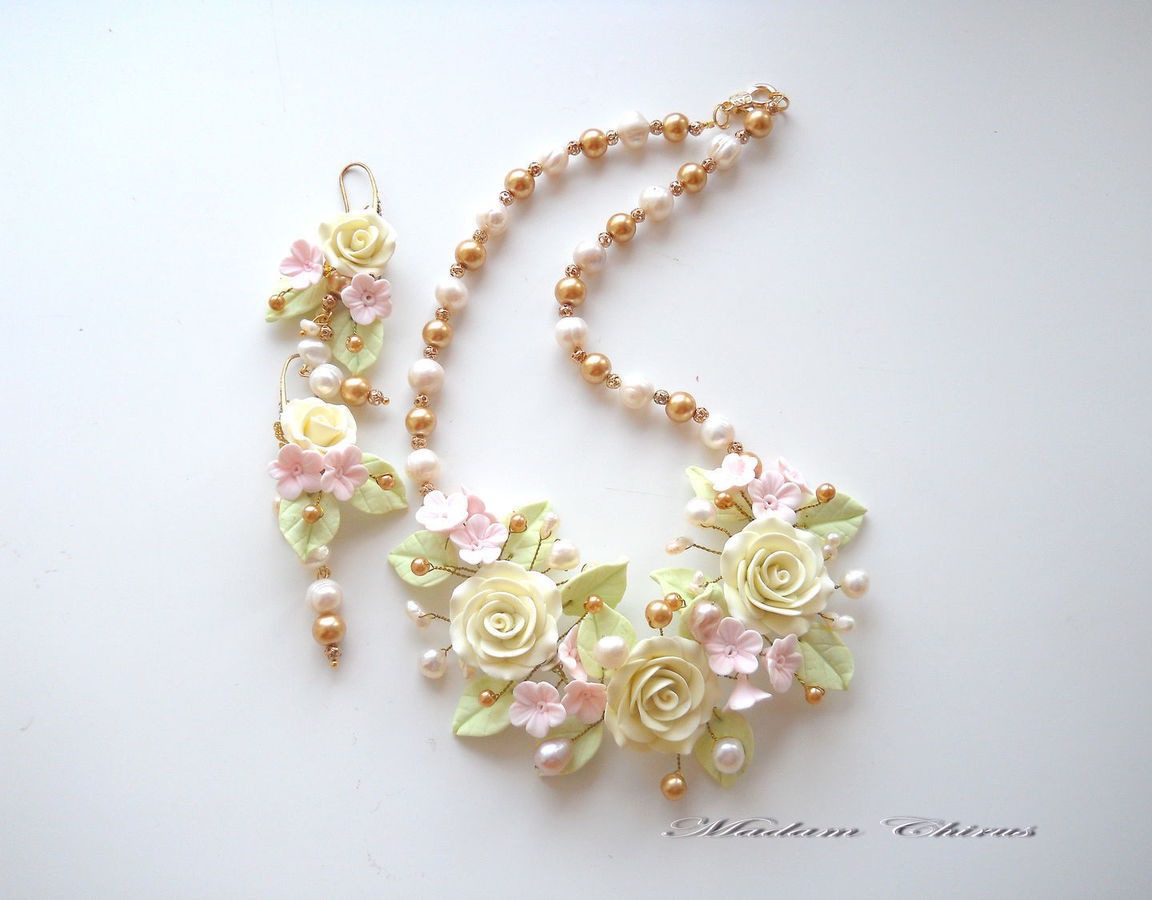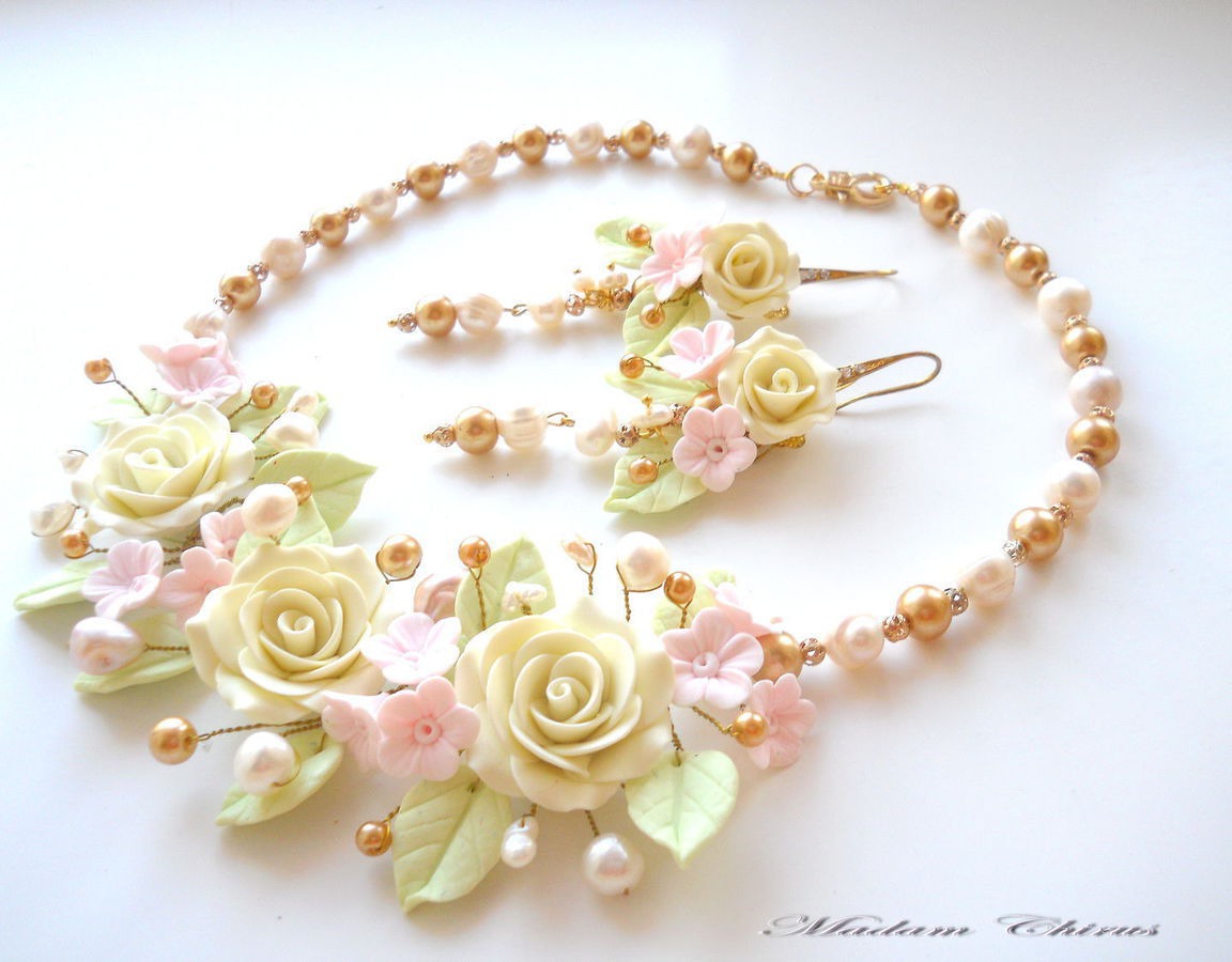 Колье и серьги с натуральным жемчугом айвори. Цветы ручной работы из полимерной глины. Нежное свадебное, вечернее украшение. К колье можно сделать браслет. При заказе украшения укажите длину колье. Отправка из Украины через 5 – 7 дней.