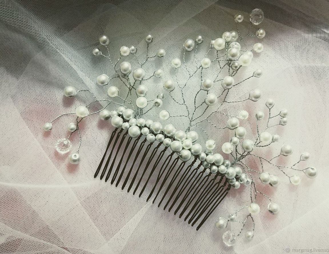 Свадебный гребень из белых и серебристых бусин, нежно дополнит образ изящной невесты. На его создание меня вдохновили море и чтение Устиновой.