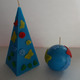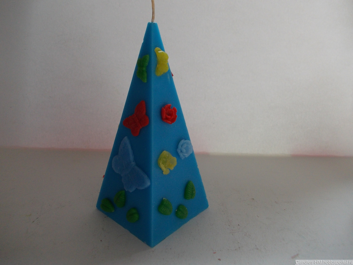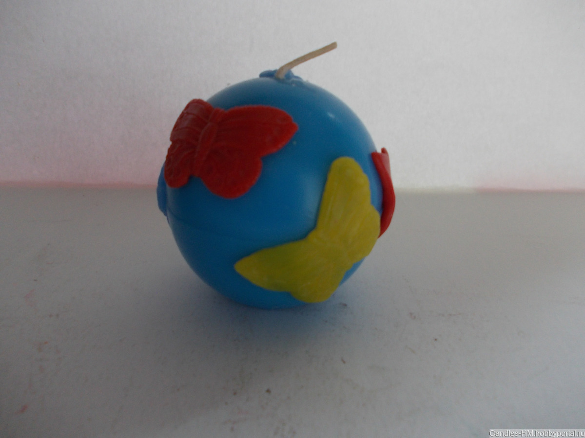 Свечи, украшенные бабочками, цветочками и листочками из парафина Размер (см) диаметр шара 6, пирамида 7х16