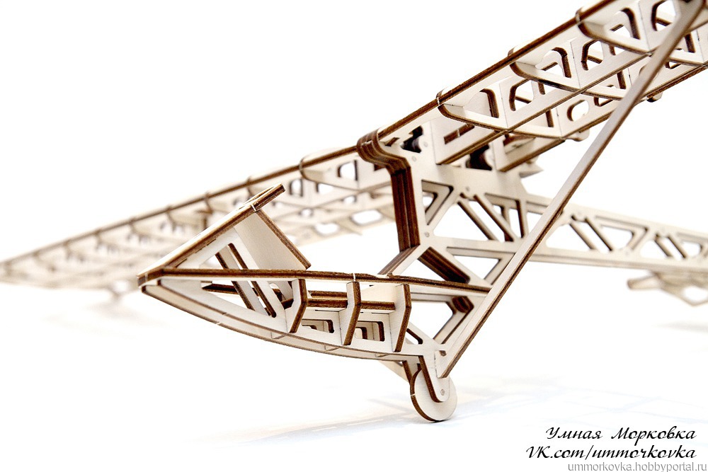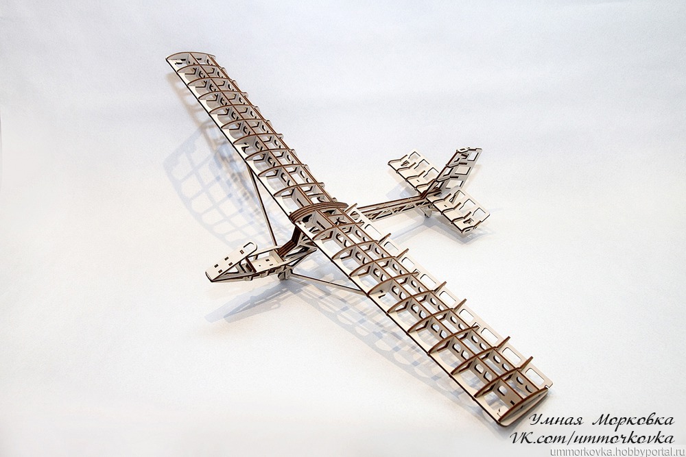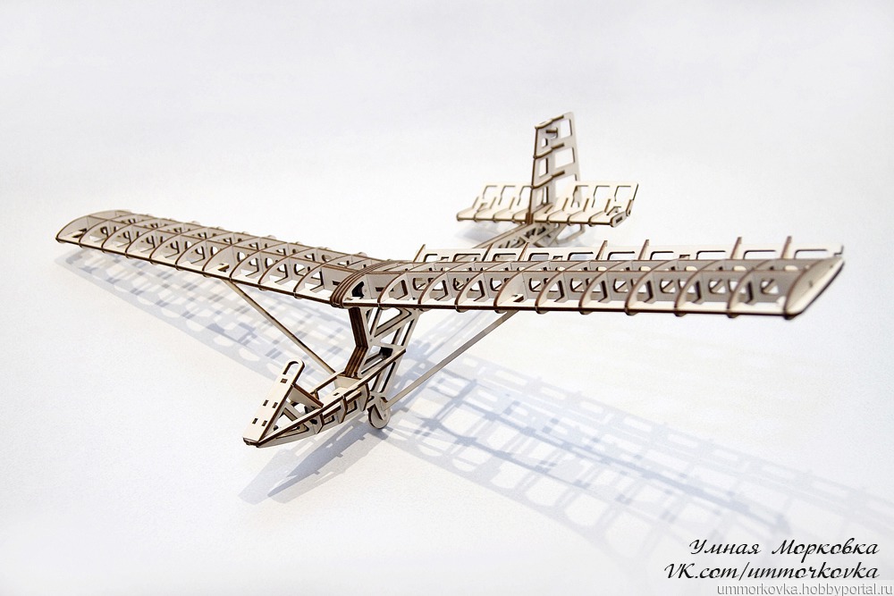 Сборная модель планера из 3 мм фанеры. Размеры планера: размах крыла 63см, длина фюзеляжа - 40см. Возрастные ограничения 6-7+. Разумеется мальчишки.