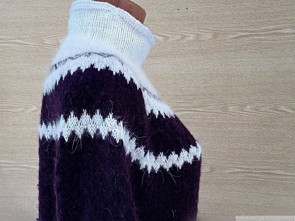 • пряжа для вязания: основная- 240 (360, 380,300) г сиреневой мохеровой пряжи (500 м /100г), контрастная- 20 г белой мохеровой пряжи (500 м /100г),