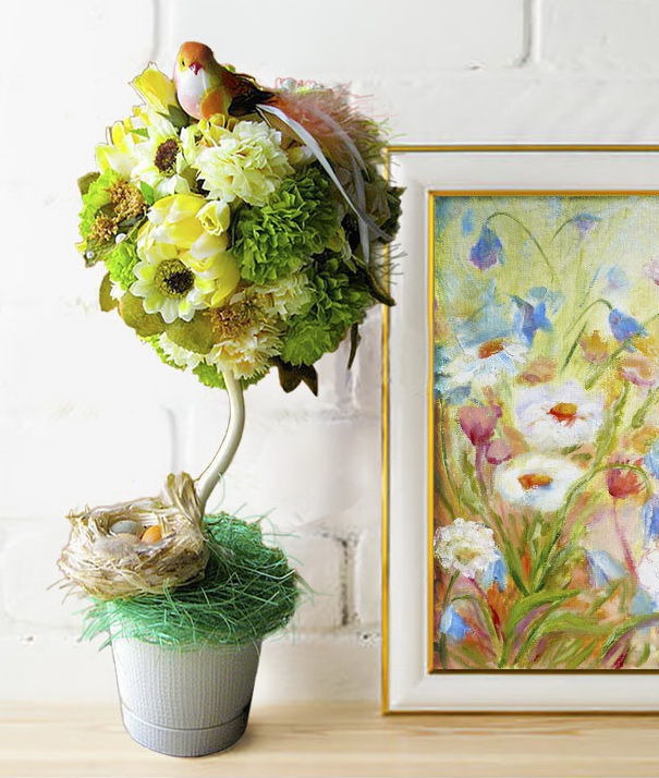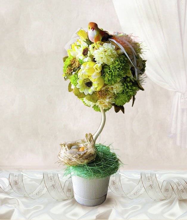 Цветочный топиарий в теплых тонах. Украшен гнездышком и очаровательной птичкой - птицей счастья для Вашего дома))))