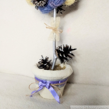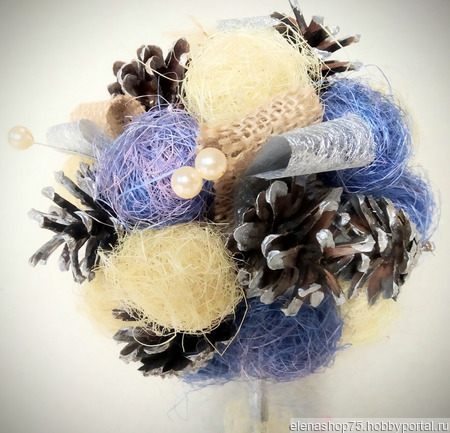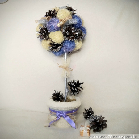 Новогодний топиарий украшен шариками из сизали, натуральными шишками, мешковиной и бусинами, надёжно посажен в горшочек на гипс. Станет оригинальным новогодним подарком или украсит Ваш интерьер.