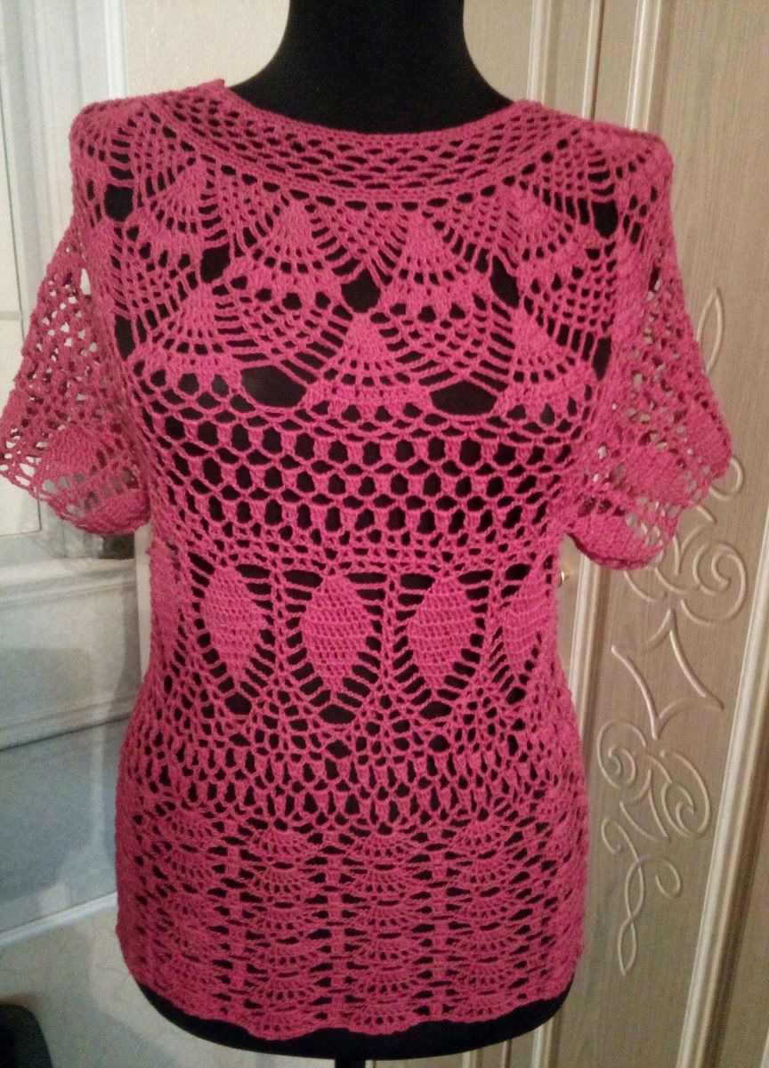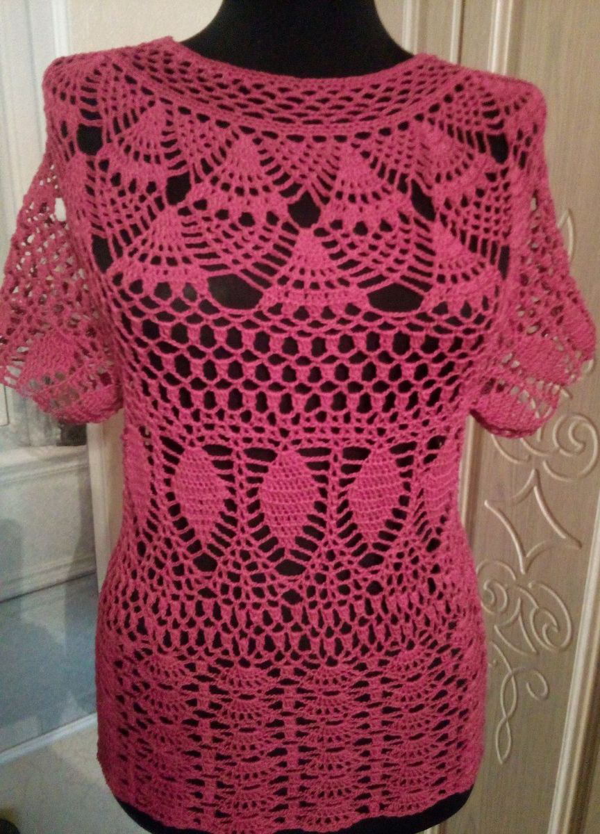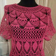 Ажурная летняя кофточка связанная крючком украсит ваш гардероб. Рукав свободный короткий. Силуэт кофточки по фигуре.