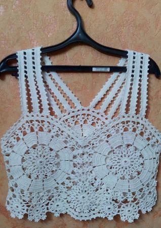 Топ связан крючком из 100% мерсеризованного хлопка из отдельных мотивов. Цвет молочный. Элегантная модель. Связано очень качественно из 100% натурального хлопка.