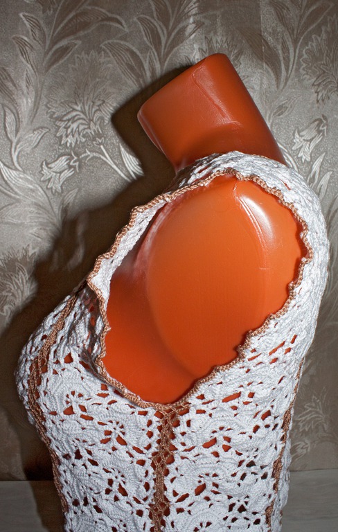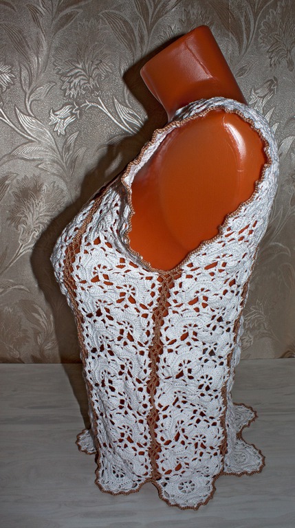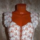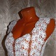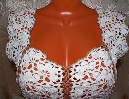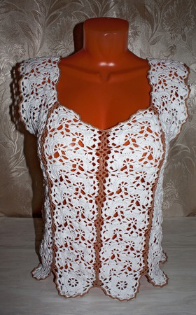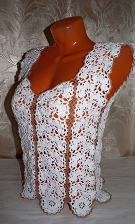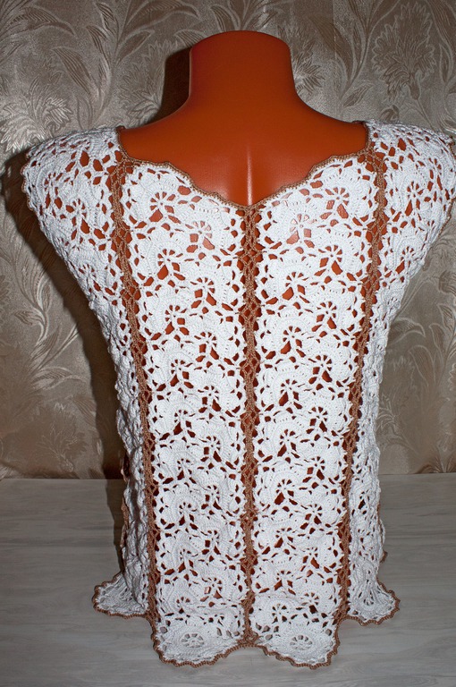 Топ связан крючком в технике ленточное кружево. Изготовлен из 100% мерсеризованного хлопка. Длина 54 см, Основной цвет белый, дополнительный шоколадный.