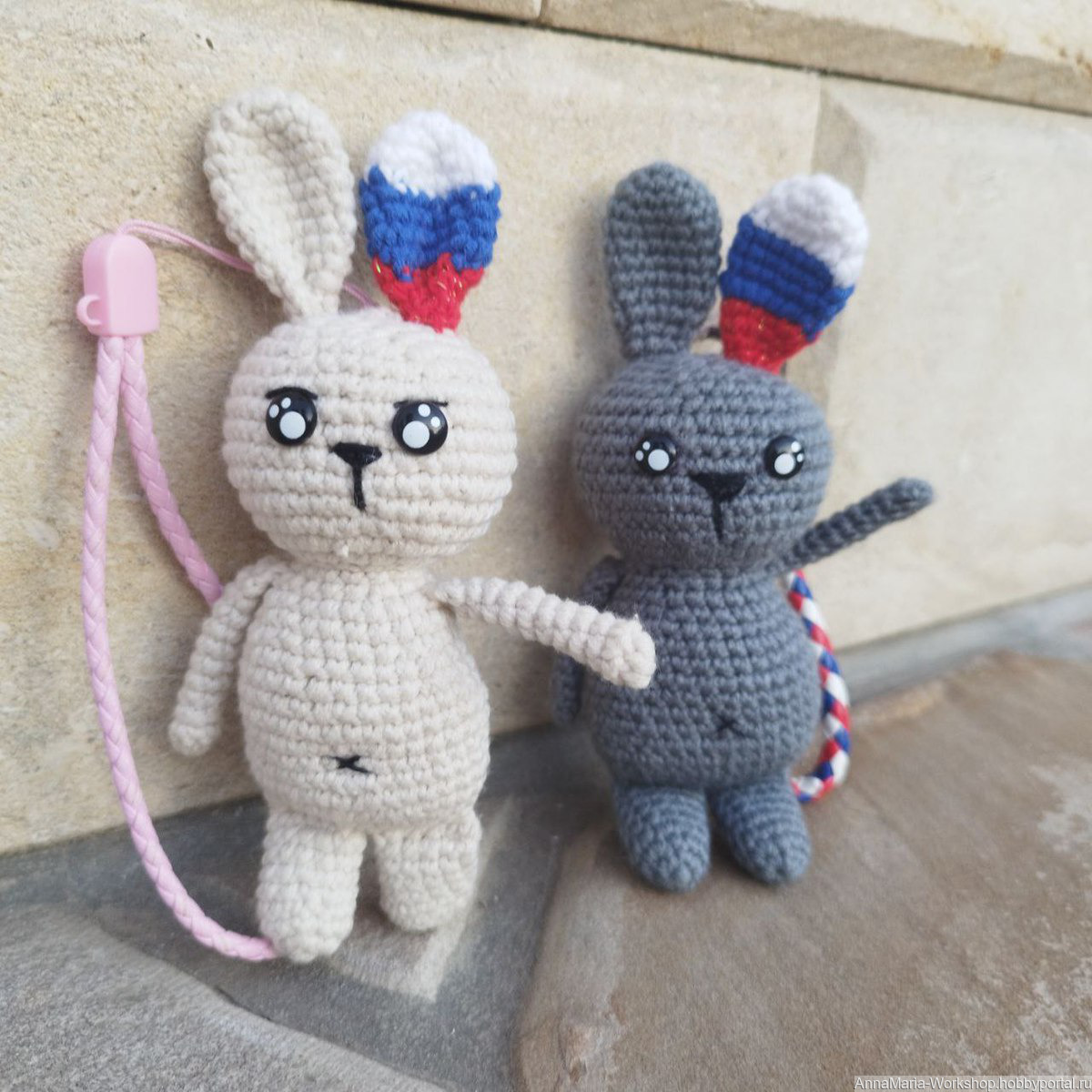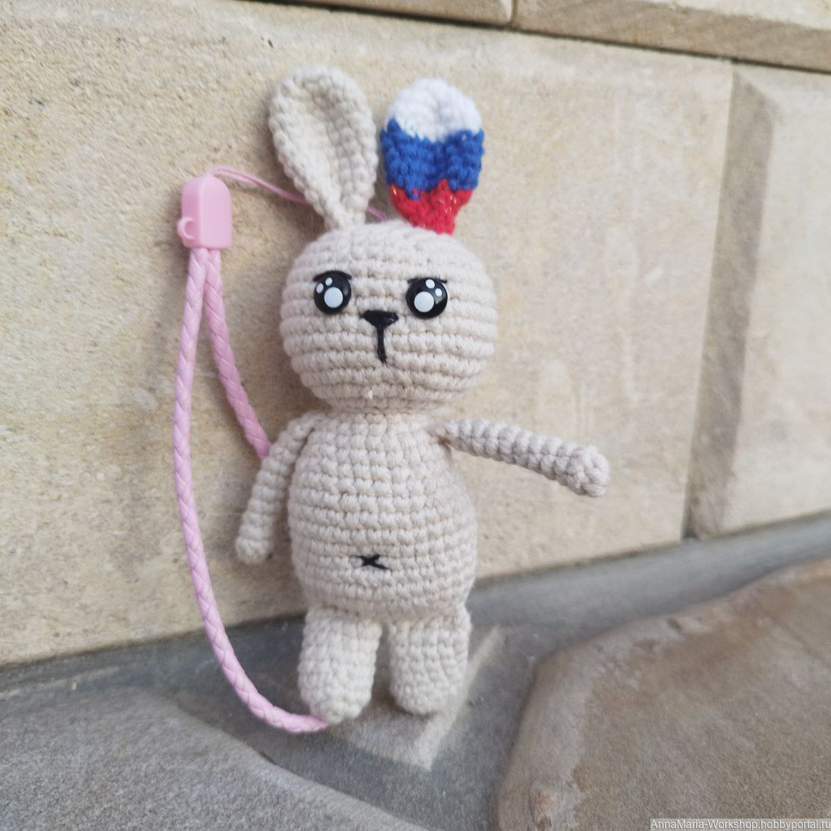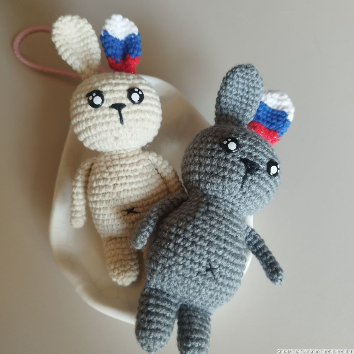 Такой вязаный отвес на сумку или брелок для ключей в виде Зайки "Патриота" станет отличным аксессуаром.