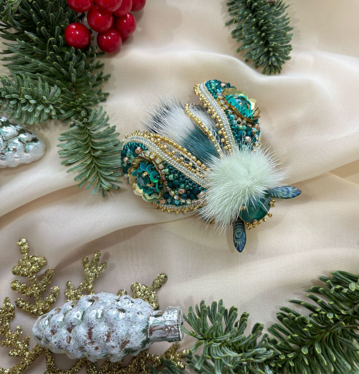 Брошь выполнена из кристаллов Сваровски, меха норки, японского бисера, пайеток