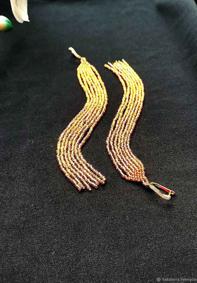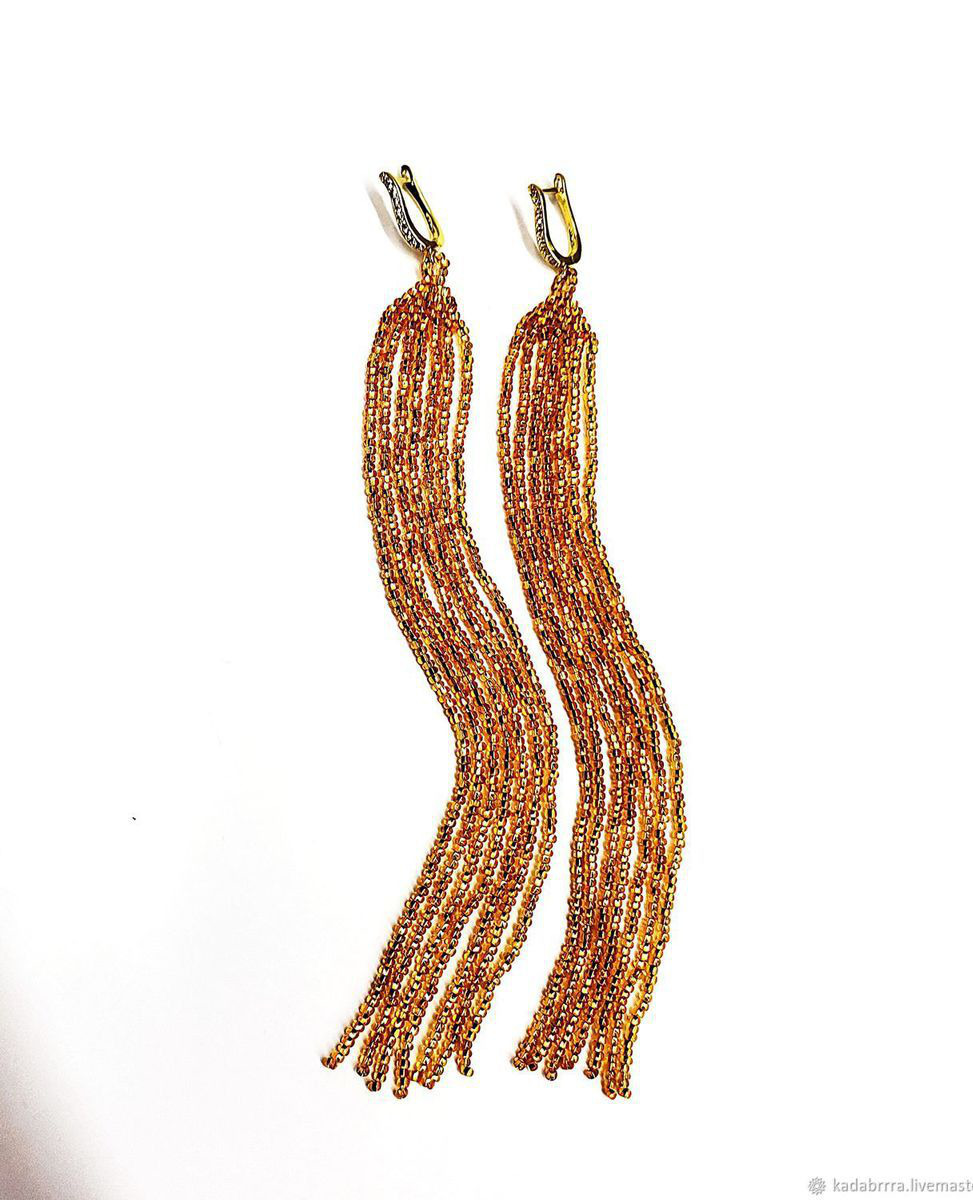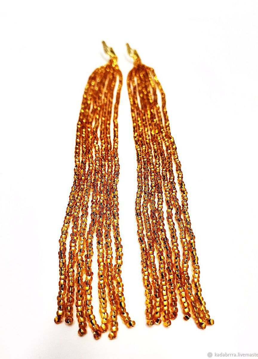 Очень длинные серьги (18 см вместе со швензой) из бисера золотого цвета. Мягкие и подвижные, очень красиво переливаются.