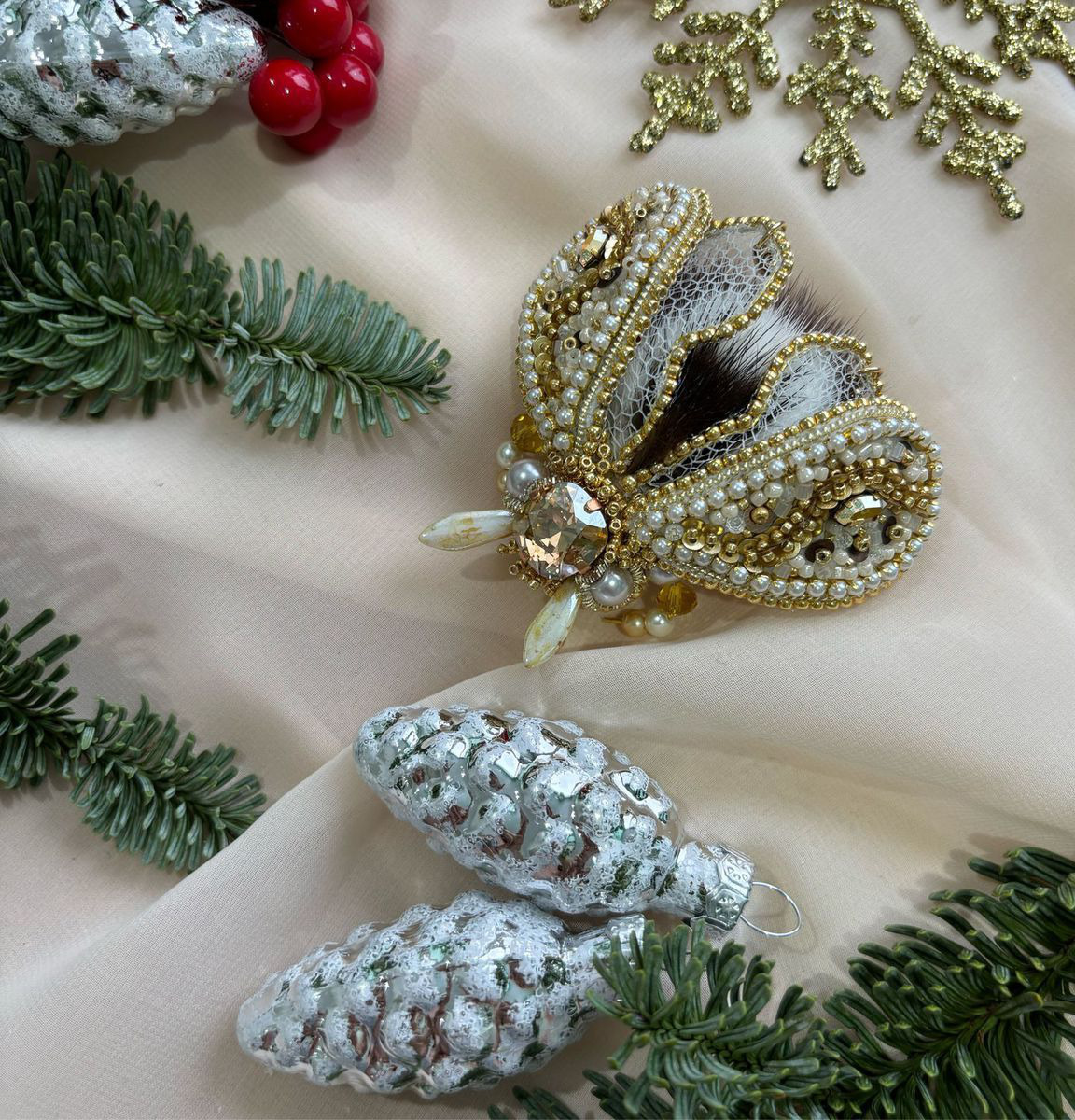 Бежевый и черные Жучки из натурального меха норки, выполнены из Японского бисера, кристаллов Сваровски, пайеток.