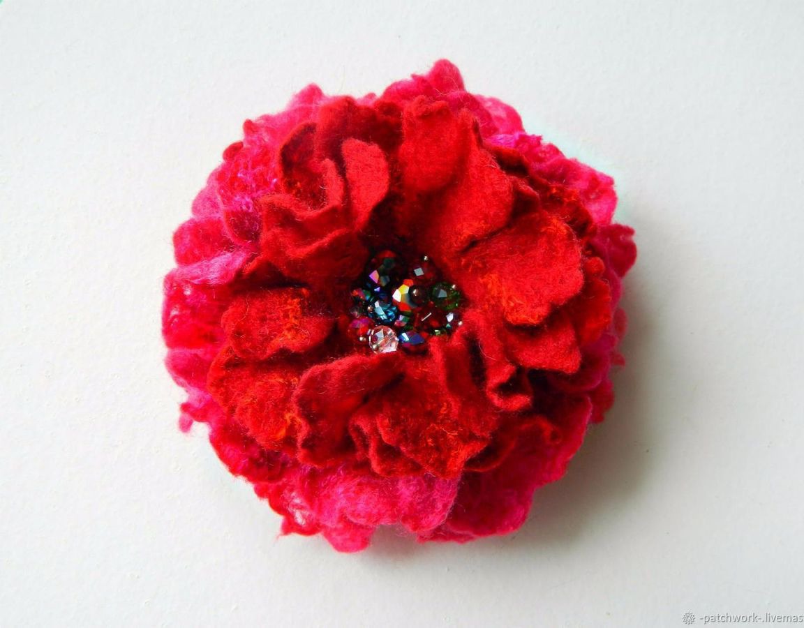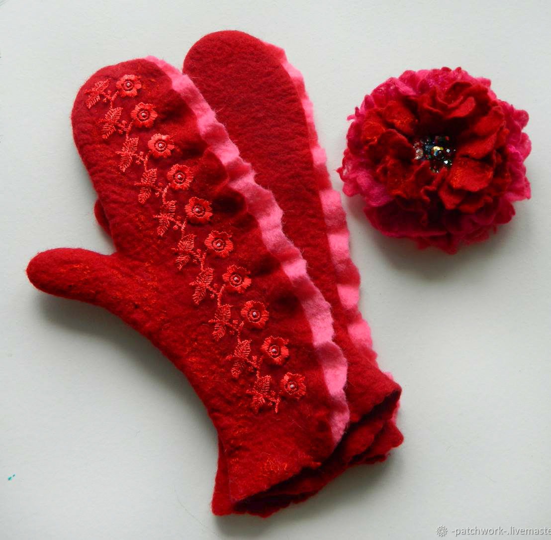 Варежки сваляны из чистой шерсти. Украшены красным кружевом в тон варежек. Они станут прекрасным подарком для ярких и модных натур. Брошь в виде цветка, расшитая чешским стеклом.