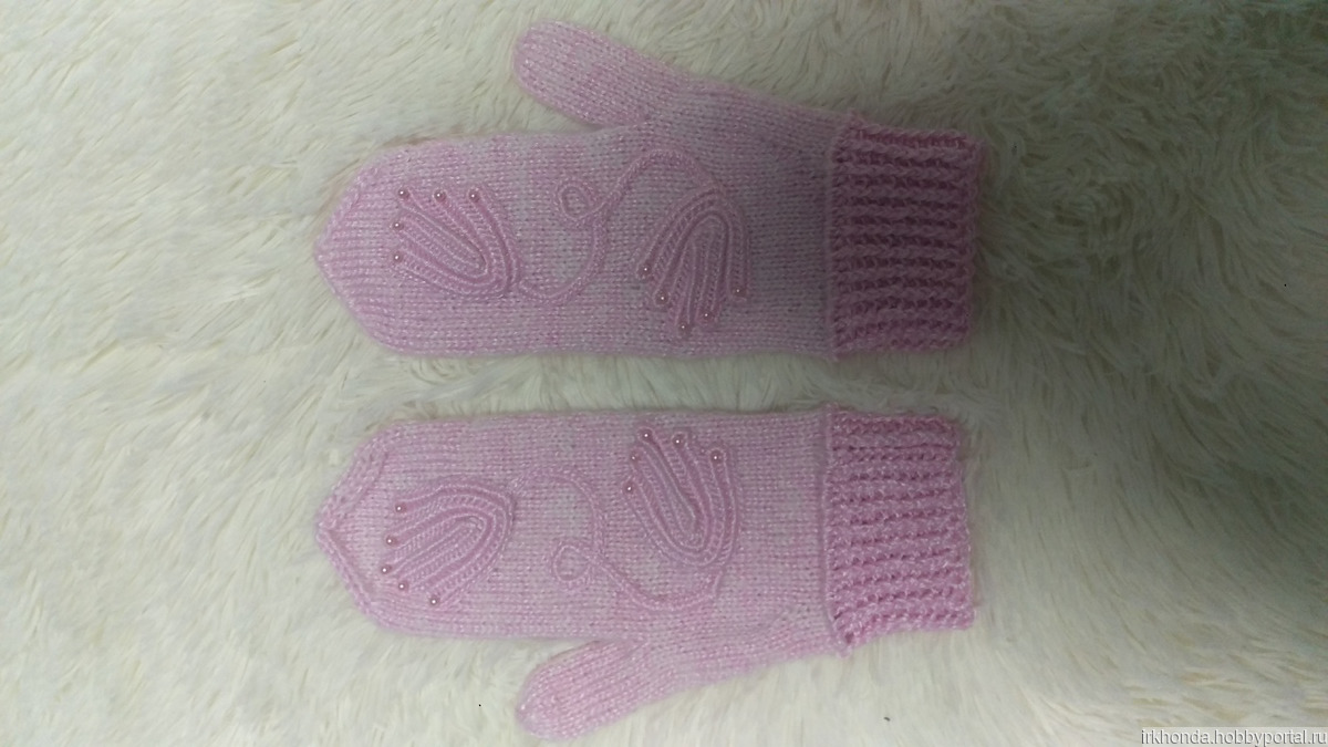 Женские варежки "Розовый иней". Ручная работа. Выполнены из хлопка-вискозы, с добавлением мохера. Украшены мотивами розового цвета, связанными на бурдоне, и бусинами. Стоимость 650 рублей