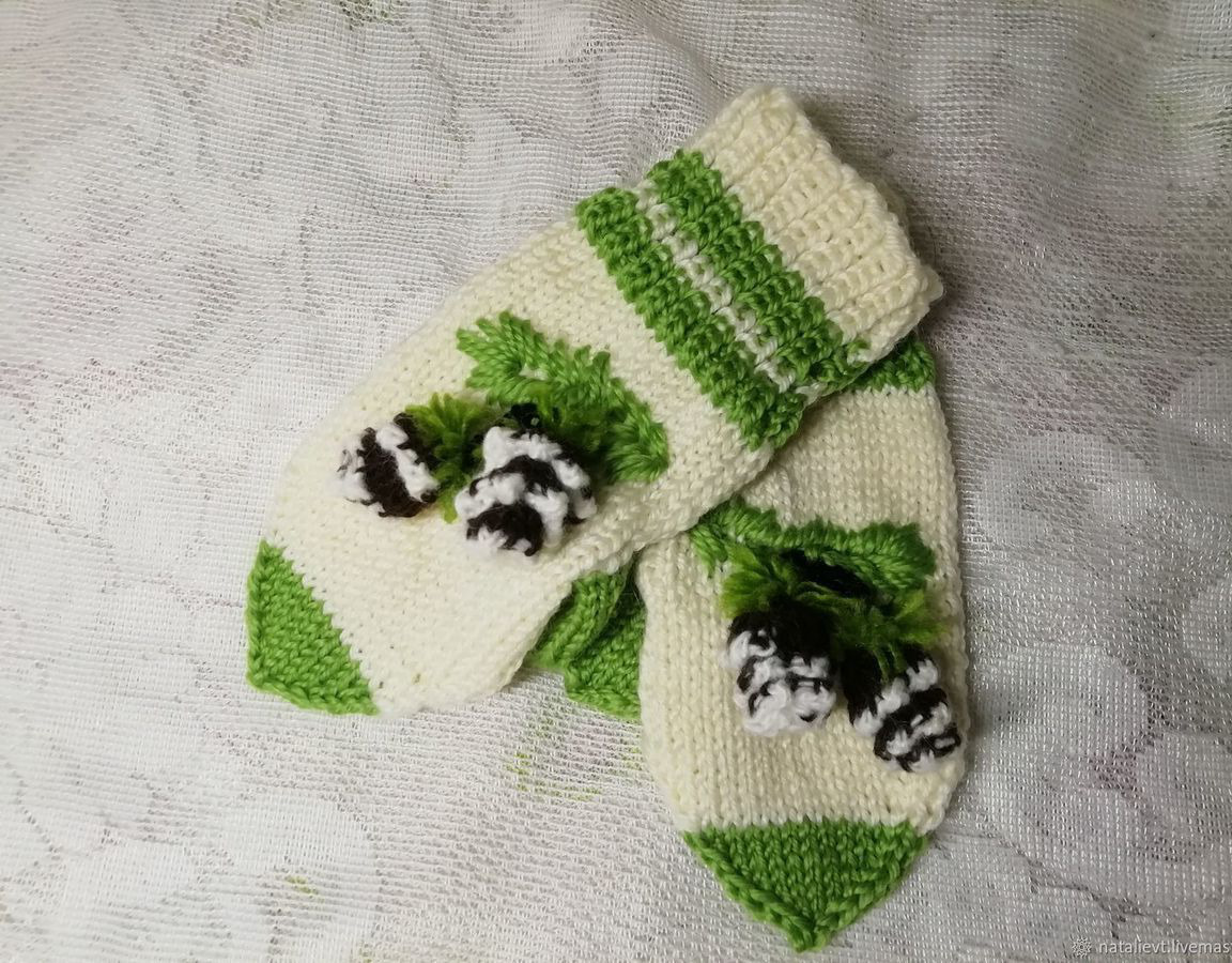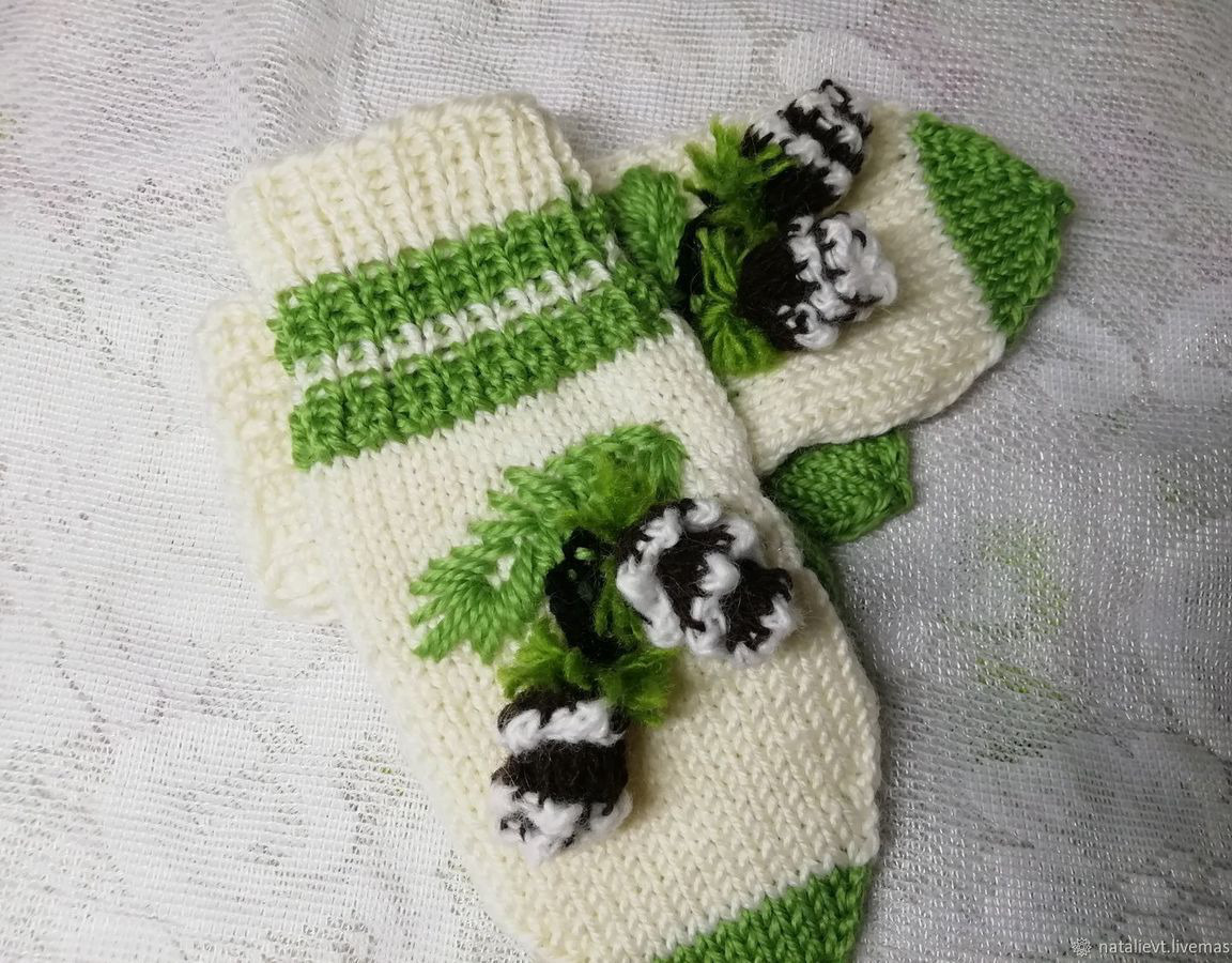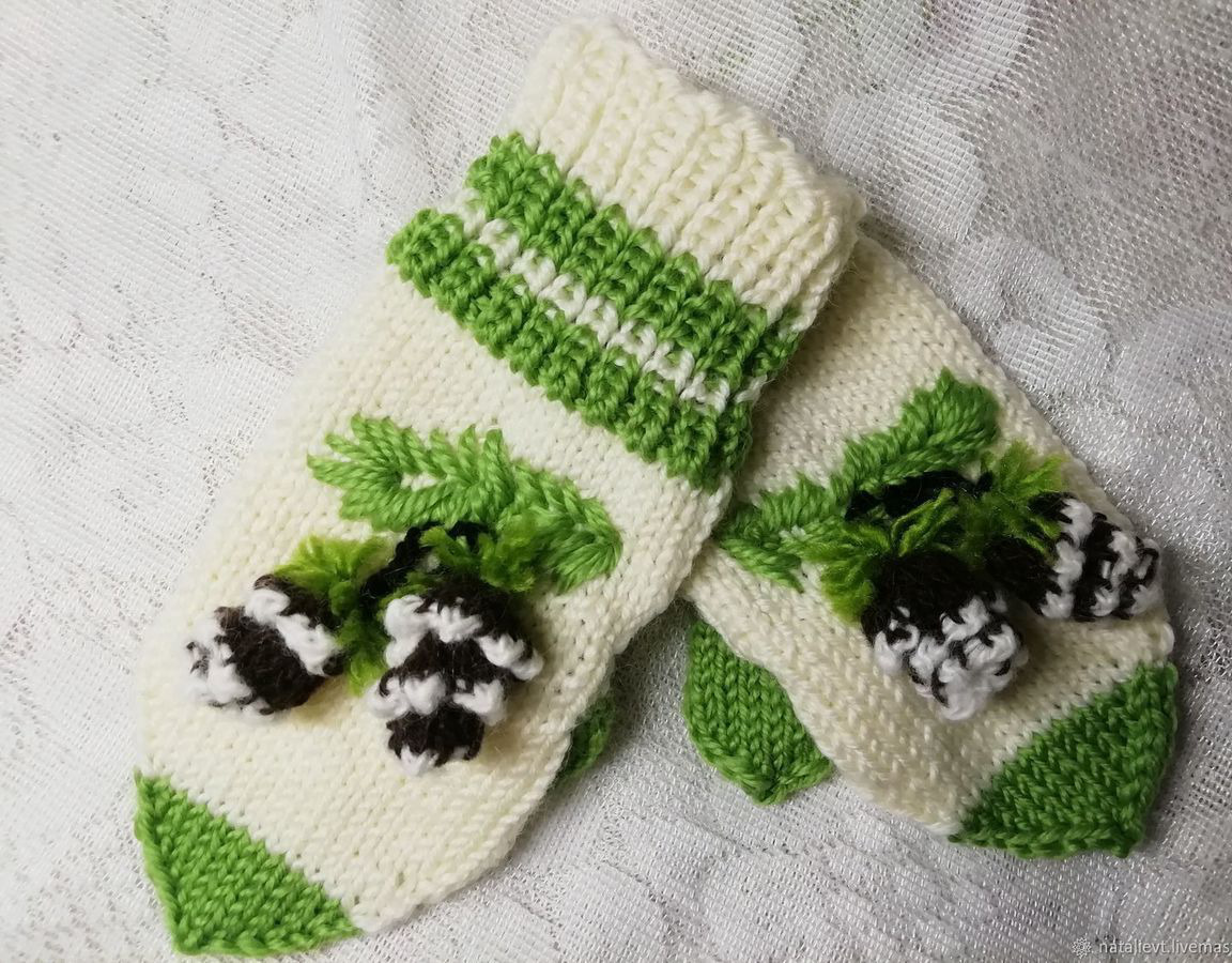 Нарядные теплые варежки из полушерстяной пряжи украшены вышитой веточкой сосны и вязаными шишечками. Варежки согреют руки в любые морозы.