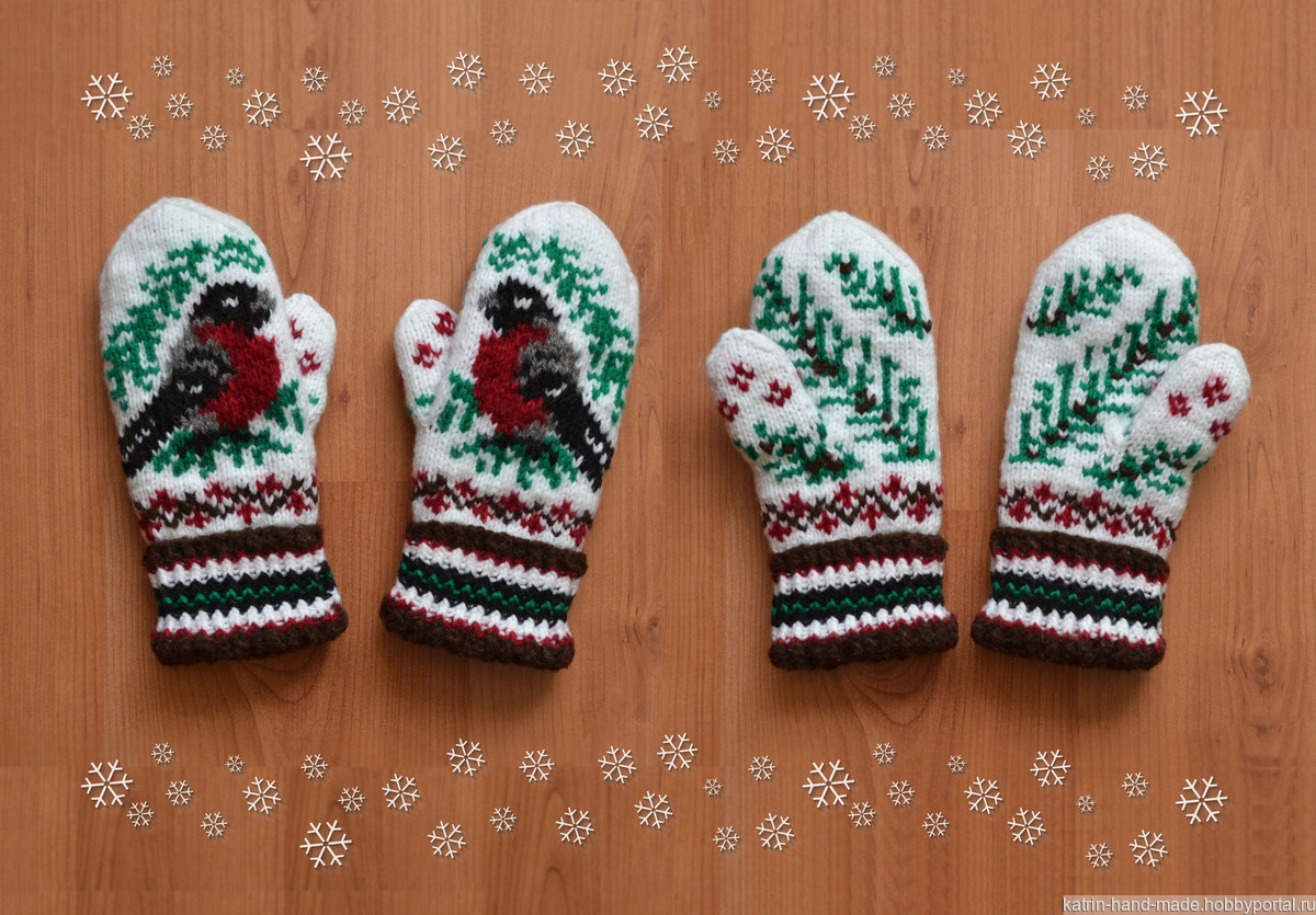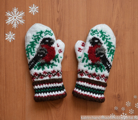 спицами, Новый год, ручная работа, жаккард, птицы, вязание, подарок, елка, варежки, девочке, снегири